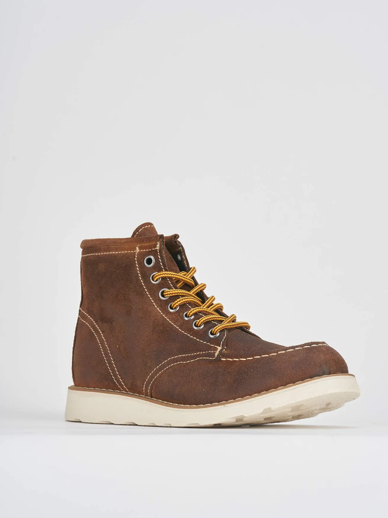La tomaia in morbido camoscio assicura un comfort eccezionale, mentre la punta tonda e le cuciture ben visibili aggiungono un tocco di carattere.