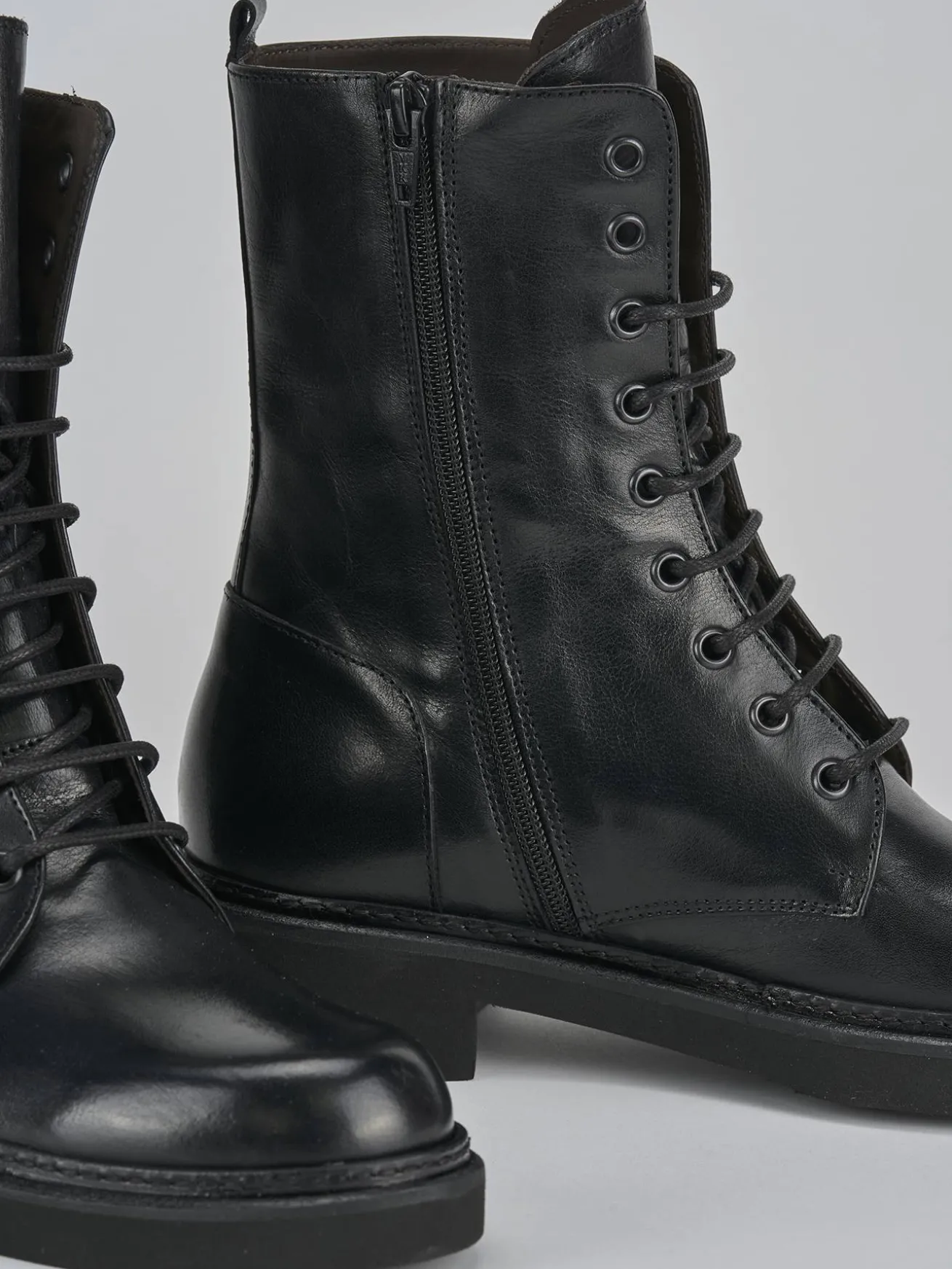 La tomaia in pelle nera avvolge il piede con classe, mentre l’allacciatura alta a 9 buchi garantisce una calzata perfetta fino alla caviglia.