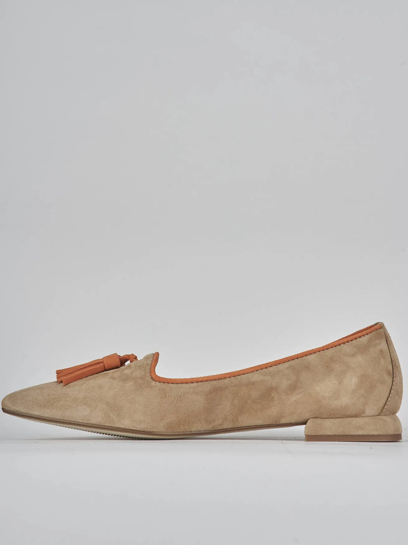 La tomaia in morbido camoscio si distingue per la punta sfilata e lo scollo a cuore, mentre le nappine decorative aggiungono un dettaglio raffinato.