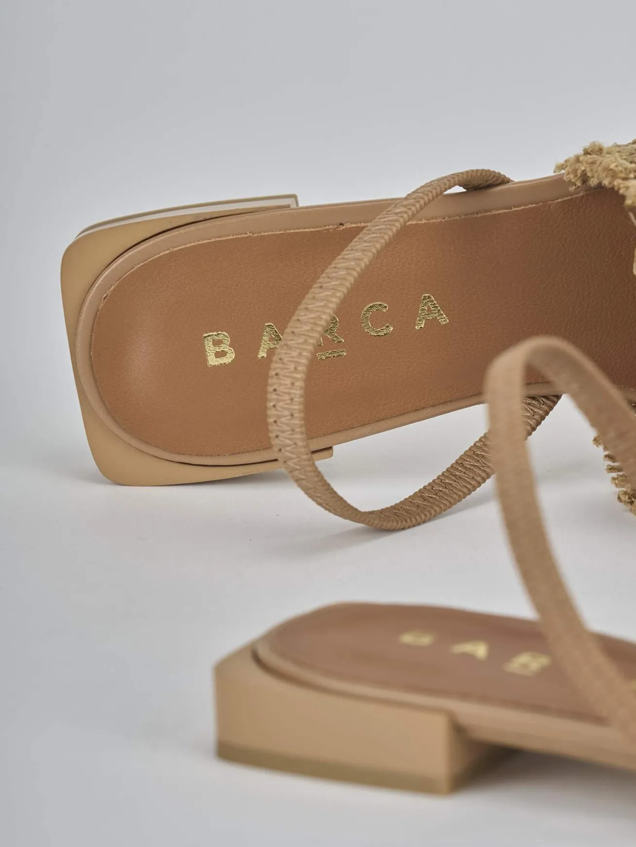 La tomaia è foderata in rafia, con una punta sfilata e dettagli di frange per un tocco di originalità.