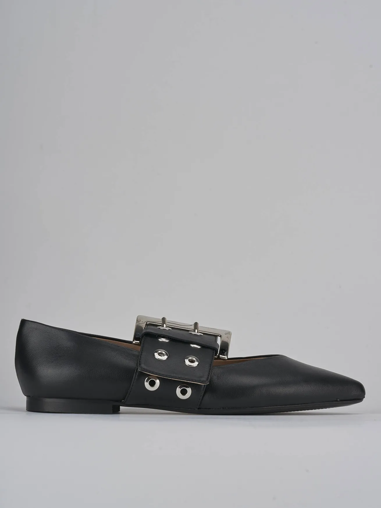 La punta sfilata e lo scollo a ‘V’ aggiungono un tocco di raffinatezza, mentre il cinturino spesso con fibbia regolabile e le borchie creano un look audace e moderno.
