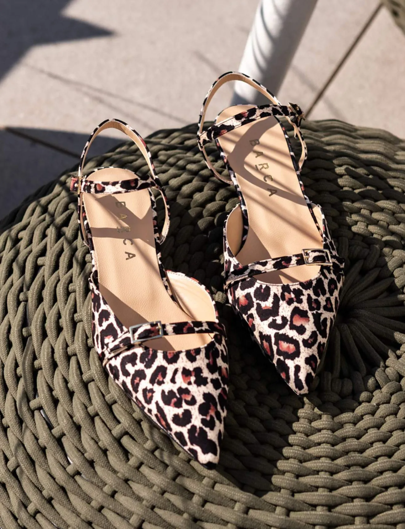 Ballerina tacco 2 cm fondo in leggerissima gomma e soletto interno in vera pelle. Tomaia in morbida pelle stampata leopardo, punta sfilata, cinturino con fibbia regolabile sul collo del piede, cinturino in caviglia e tacco stabile a cono per un look co