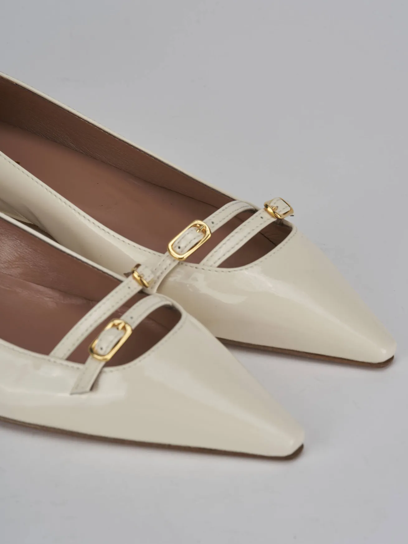 Ballerina tacco 2 cm fondo in cuoio e soletto interno in vera pelle. tomaia in morbida pelle effetto verniciato, punta sfilata, cuciture a mano, due cinturini con fibbia regolabile in punta e tacco a cono stabile. Perfetto con un tailleur o un vestito.