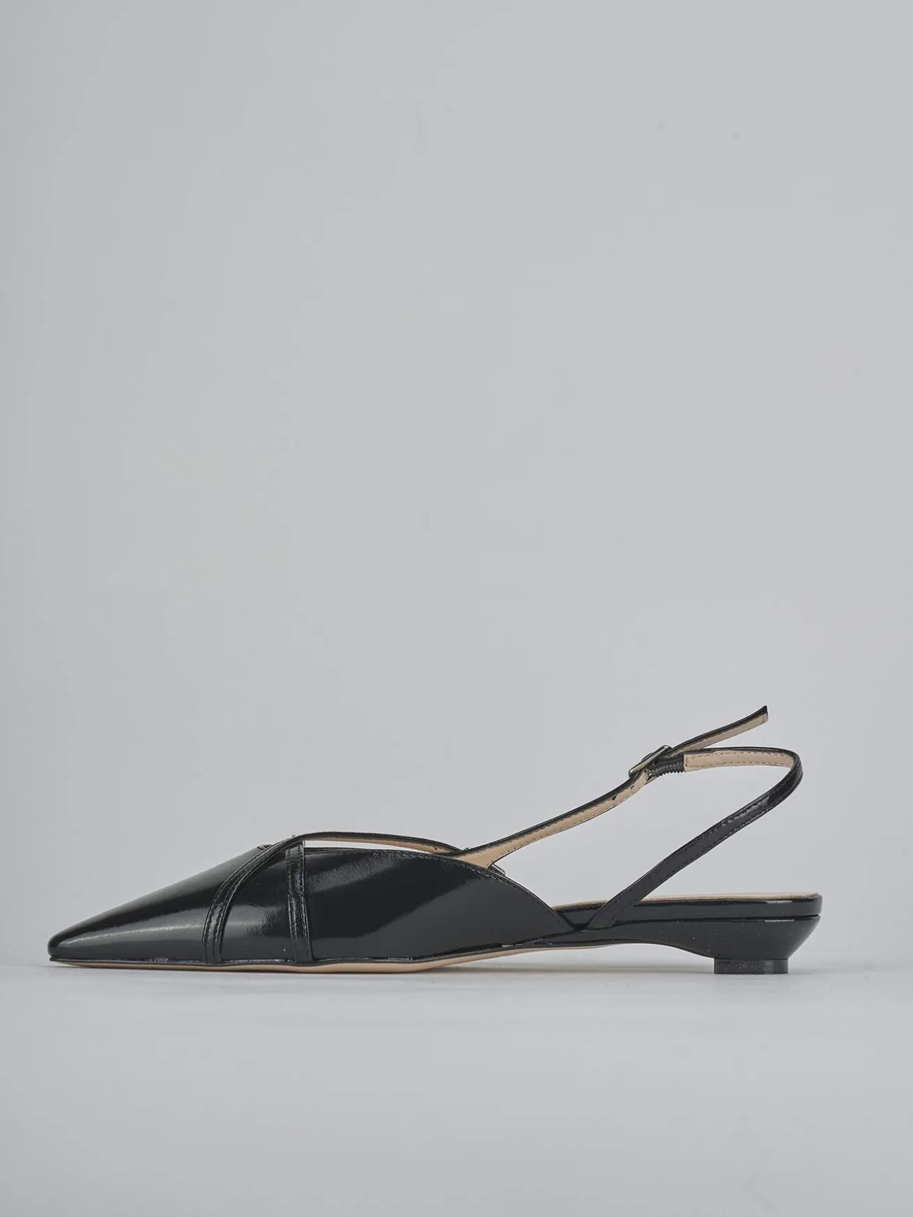 Ballerina tacco 2 cm fondo in cuoio e soletto interno in vera pelle. Tomaia in morbida pelle effetto verniciato, punta sfilata, scollo a ‘U’, due cinturini incrociati con fibbia sul collo del piede, cinturino sul tallone con fibbia regolabile per il massimo del comfort. Nuovissimo tacco a cono.