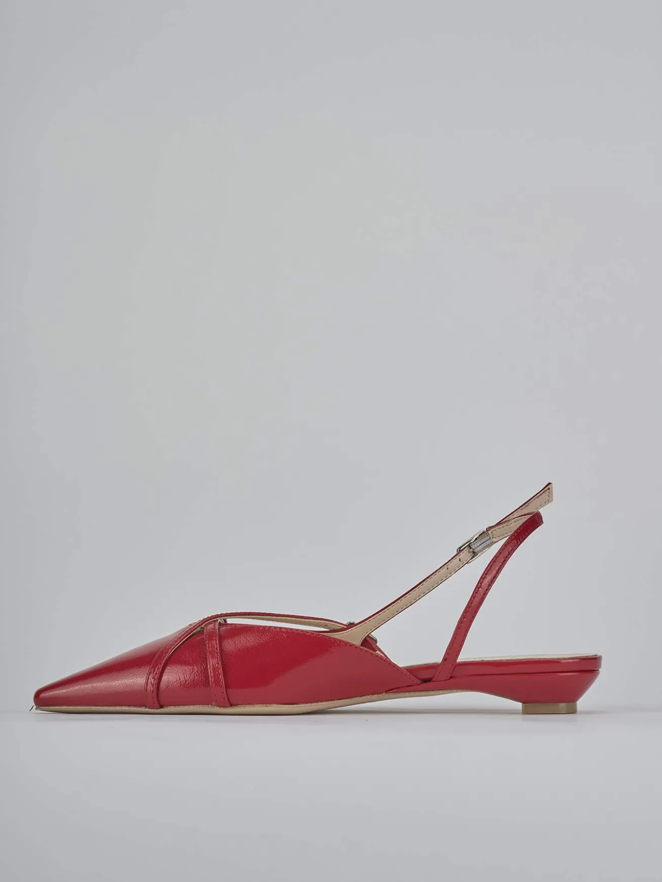Ballerina tacco 2 cm fondo in cuoio e soletto interno in vera pelle. Tomaia in morbida pelle effetto verniciato, punta sfilata, scollo a ‘U’, due cinturini incrociati con fibbia sul collo del piede, cinturino sul tallone con fibbia regolabile per il massimo del comfort. Nuovissimo tacco a cono.