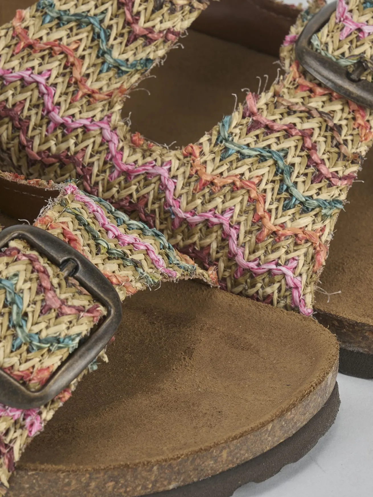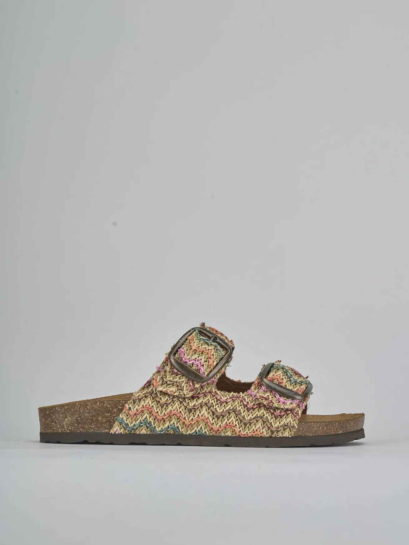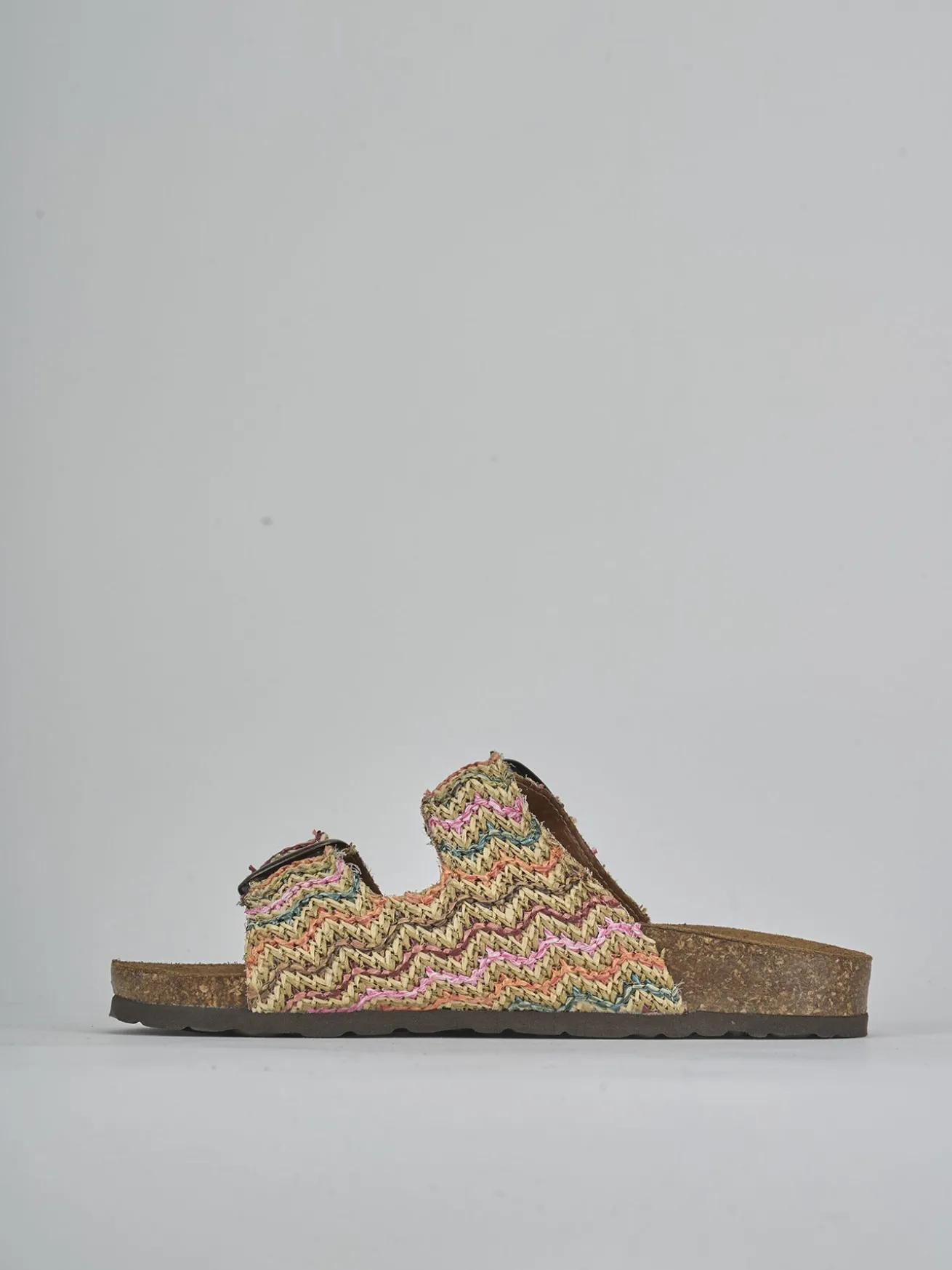 Realizzata in tessuto di rafia multicolor, questa ciabatta presenta una tomaia in morbido camoscio foderato, ideale per chi cerca stile e comodità.