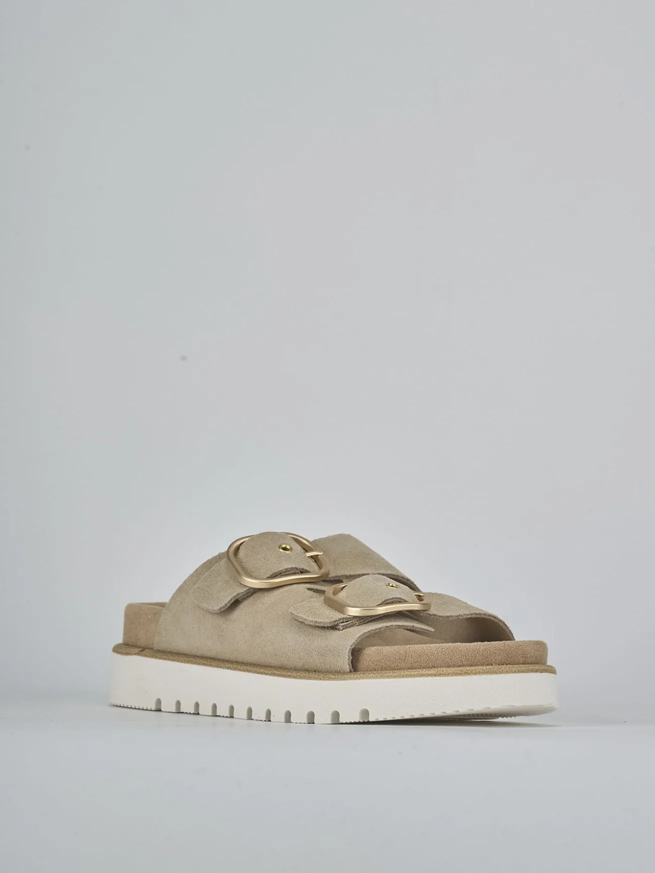 Realizzate in morbido camoscio, queste ciabatte presentano una punta affusolata e due grandi fasce con fibbia regolabile sul collo del piede, offrendo una calzata personalizzabile e sicura.