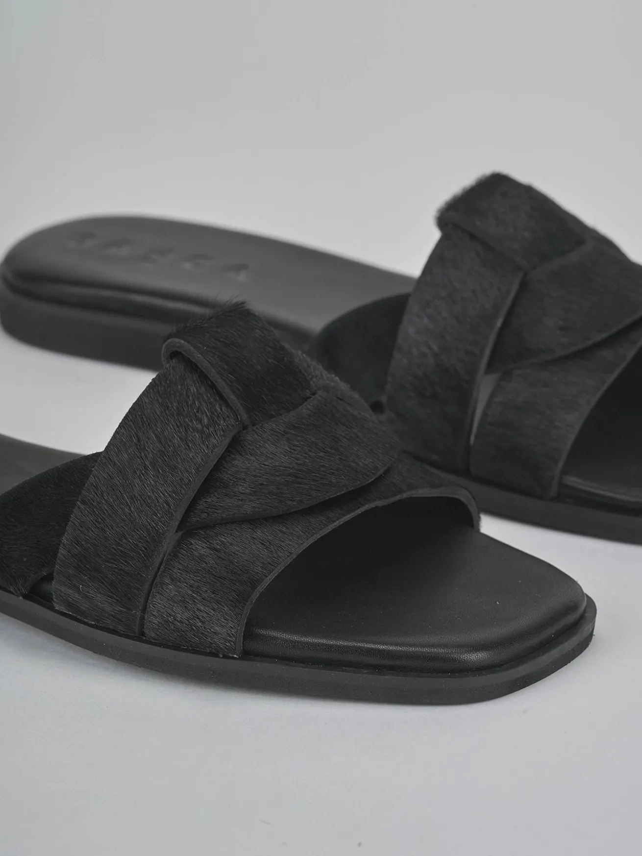 La tomaia in morbida pelle, ricoperta di raffinato cavallino, si sposa con una punta leggermente squadrata e una fascia unica a incastro.