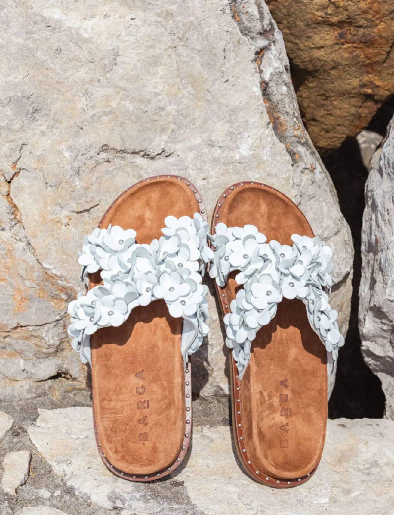 La tomaia è realizzata in morbida pelle, con fasce incrociate che abbracciano delicatamente il piede.