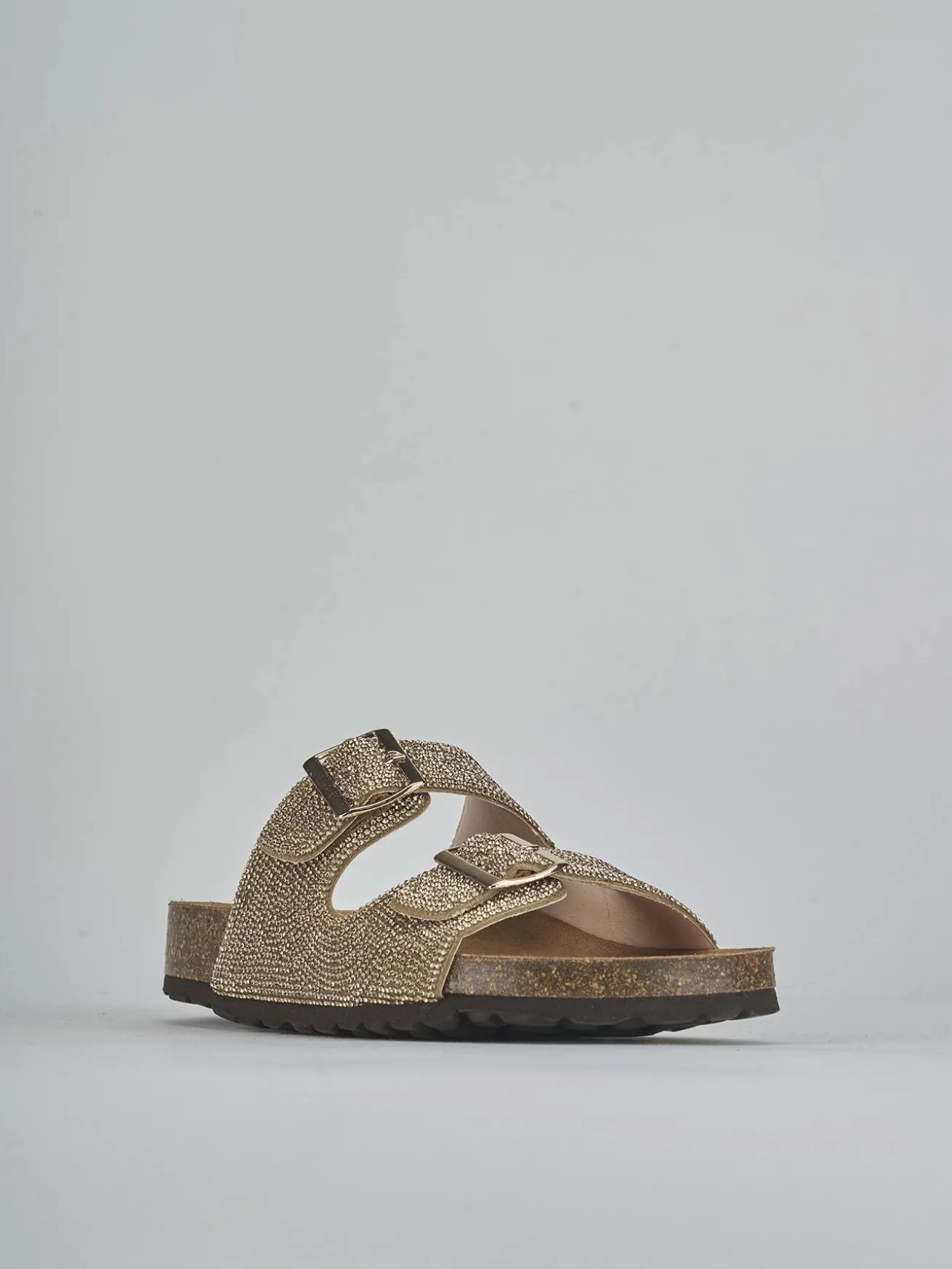 La tomaia è in morbida pelle, arricchita da due fasce con fibbia regolabile, impreziosite da eleganti strass.