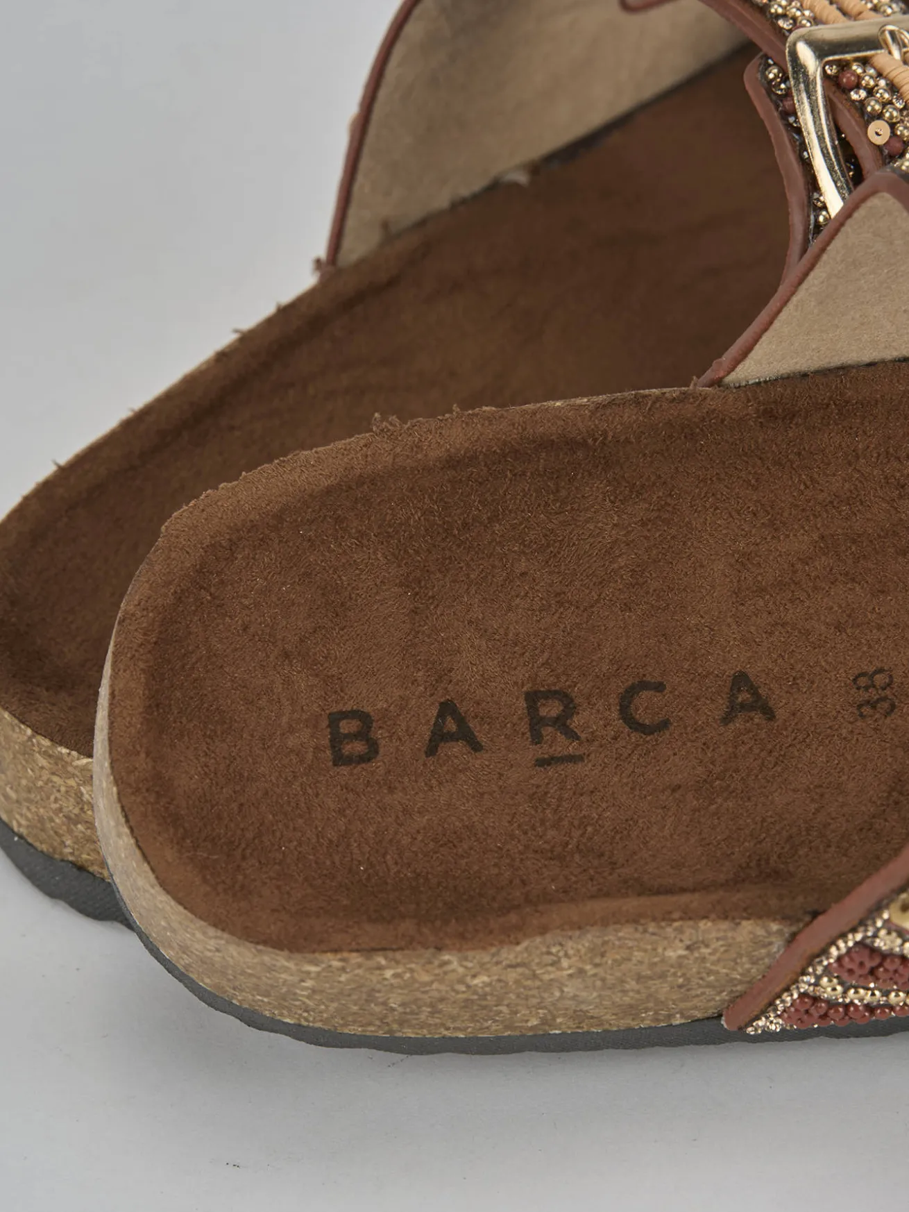 Realizzate in pelle bronzo, queste ciabatte presentano una lavorazione unica con mini borchie, strass e perline che aggiungono un tocco di raffinatezza.