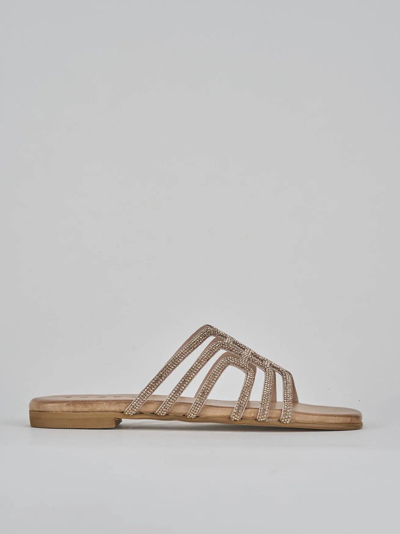 La tomaia è realizzata in morbida pelle, arricchita da minifascette intrecciate con applicazioni di strass che donano un tocco di brillantezza.