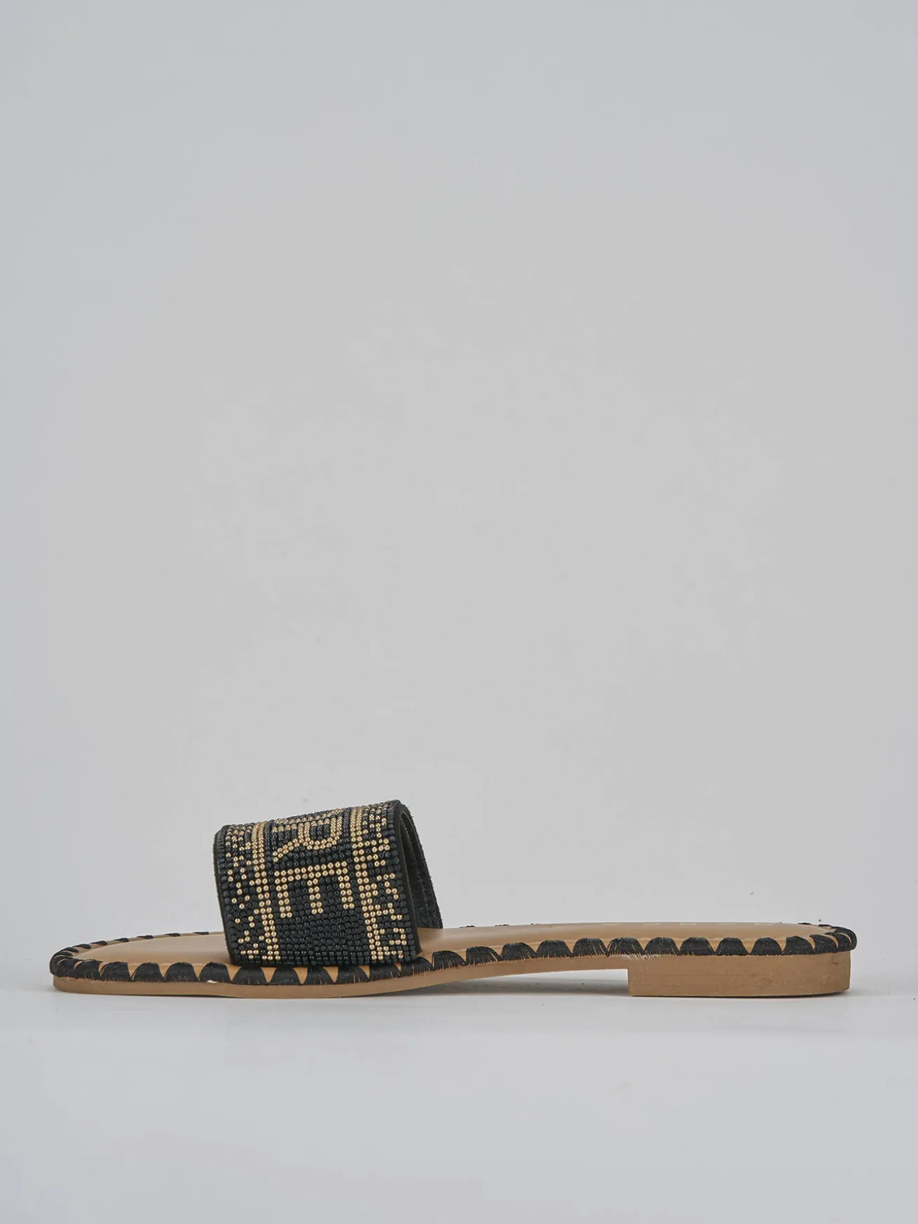 La tomaia è decorata da una fascia unica con miniborchie, perfetta per un look easy-chic, ideale per ogni occasione casual.