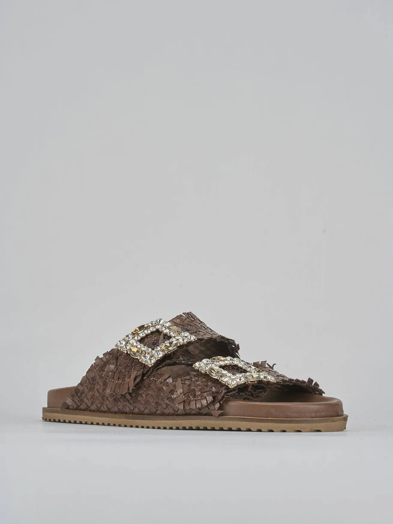 La tomaia è in morbida pelle finemente intrecciata, arricchita da due fasce con fibbie regolabili, che si adattano perfettamente al piede.