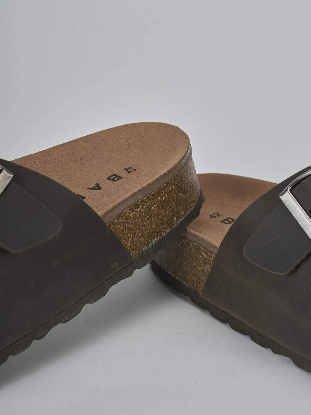 La tomaia è caratterizzata da due fasce in morbida pelle, arricchite da grandi fibbie regolabili, per un look raffinato e pratico.