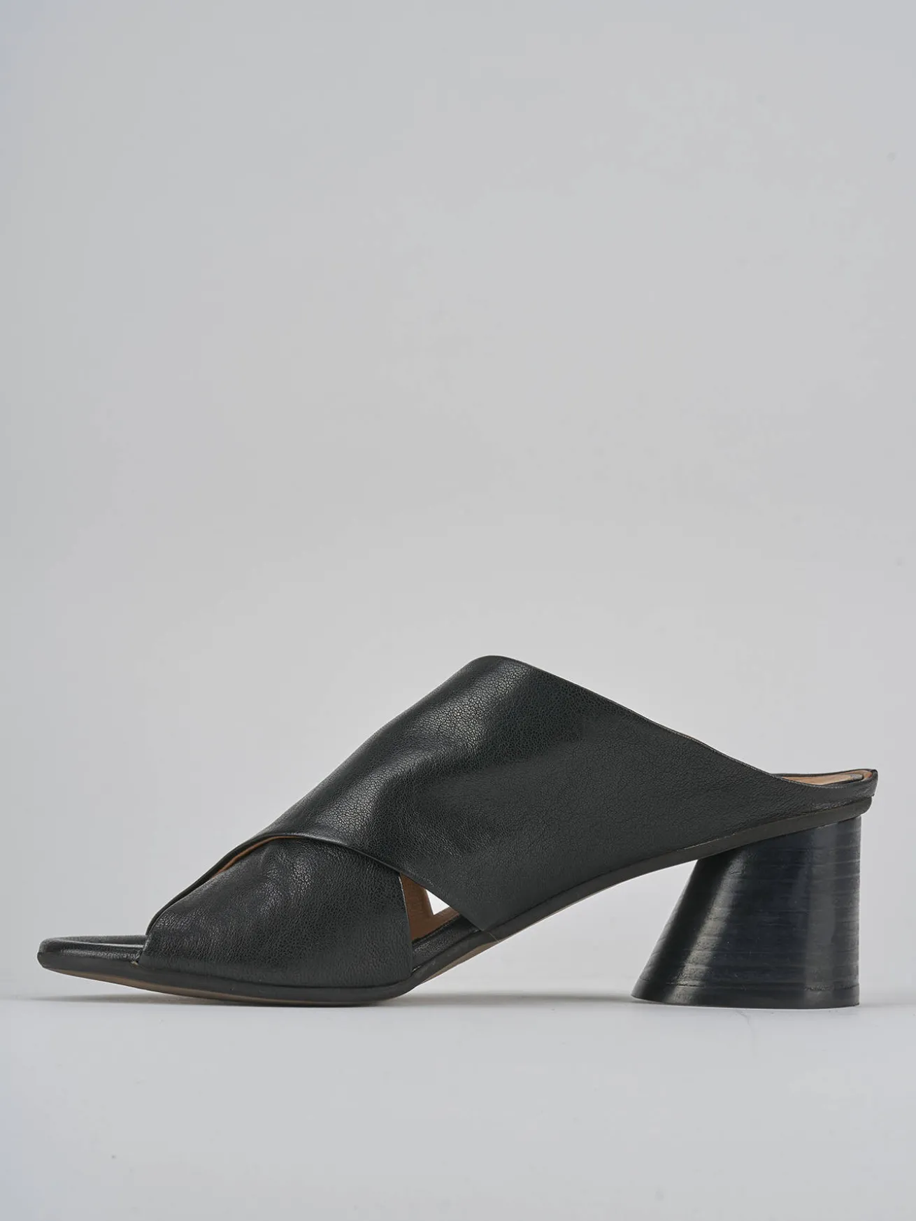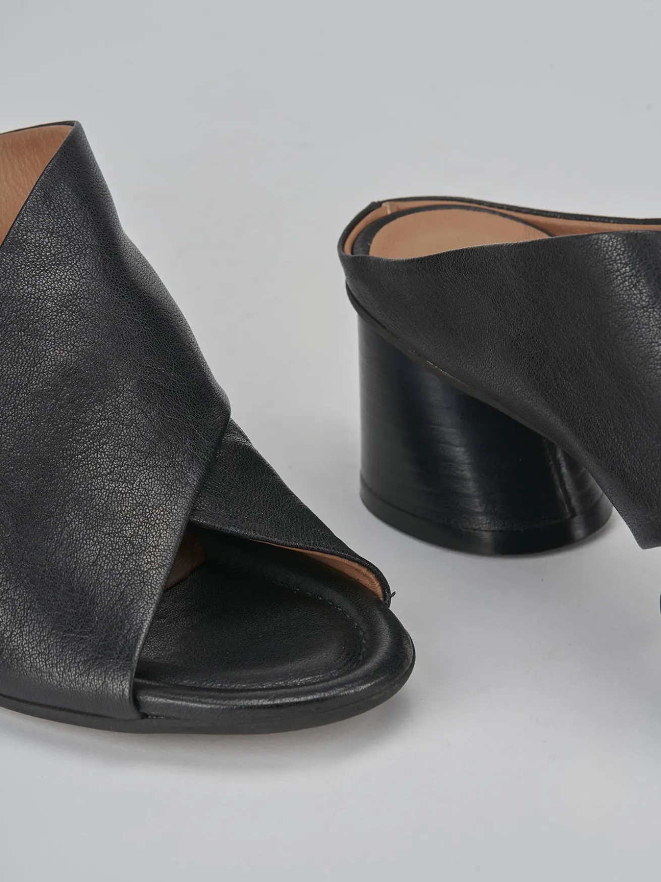 Ciabatta tacco 5 cm fondo in cuoio e soletto interno in vera pelle. Tomaia in morbida pelle, punta affusolata, fasce ampie incrociate e tacco comodo effetto legno. Perfetto con un vestito o degli shorts.