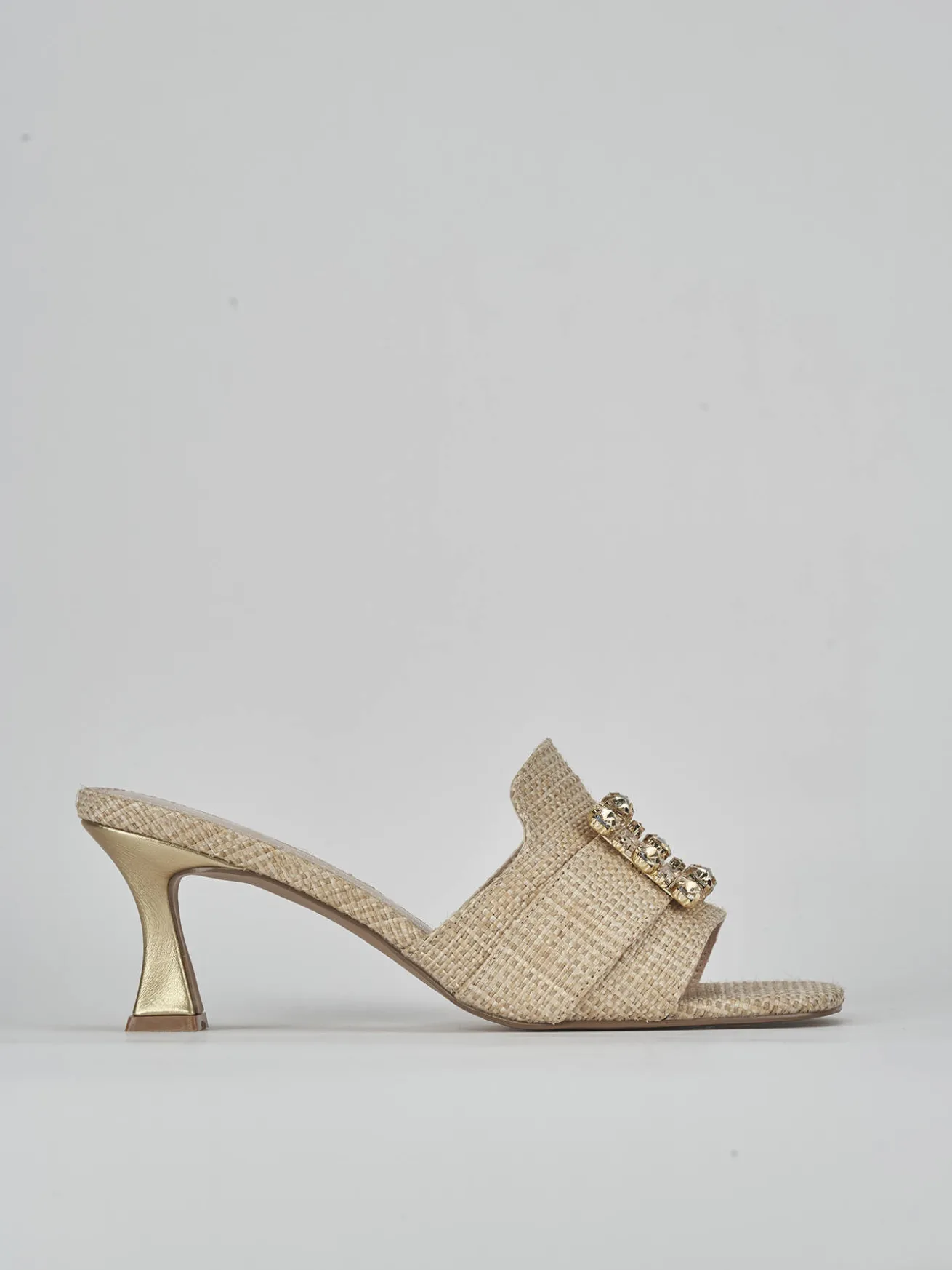 Ciabatta tacco 6 cm fondo in leggerissima gomma e soletto interno in vera pelle. tomaia in morbida pelle foderata da nuovissimo tessuto rafia in fantasia bicolor, punta squadrata, fascia unica, accessorio e tacco rocchetto per un look chic.
