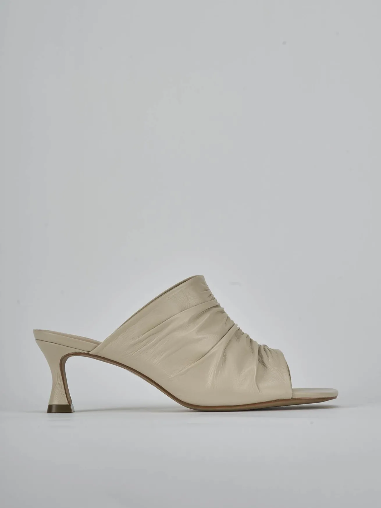 Ciabatta tacco 6 cm fondo in leggerissima gomma e soletto interno in vera pelle. Tomaia in morbida pelle, punta leggermente squadrata, fascia unica con particolarissima arricciatura rimborsata e tacco rocchetto per un look che ti farà sicuramente notare.