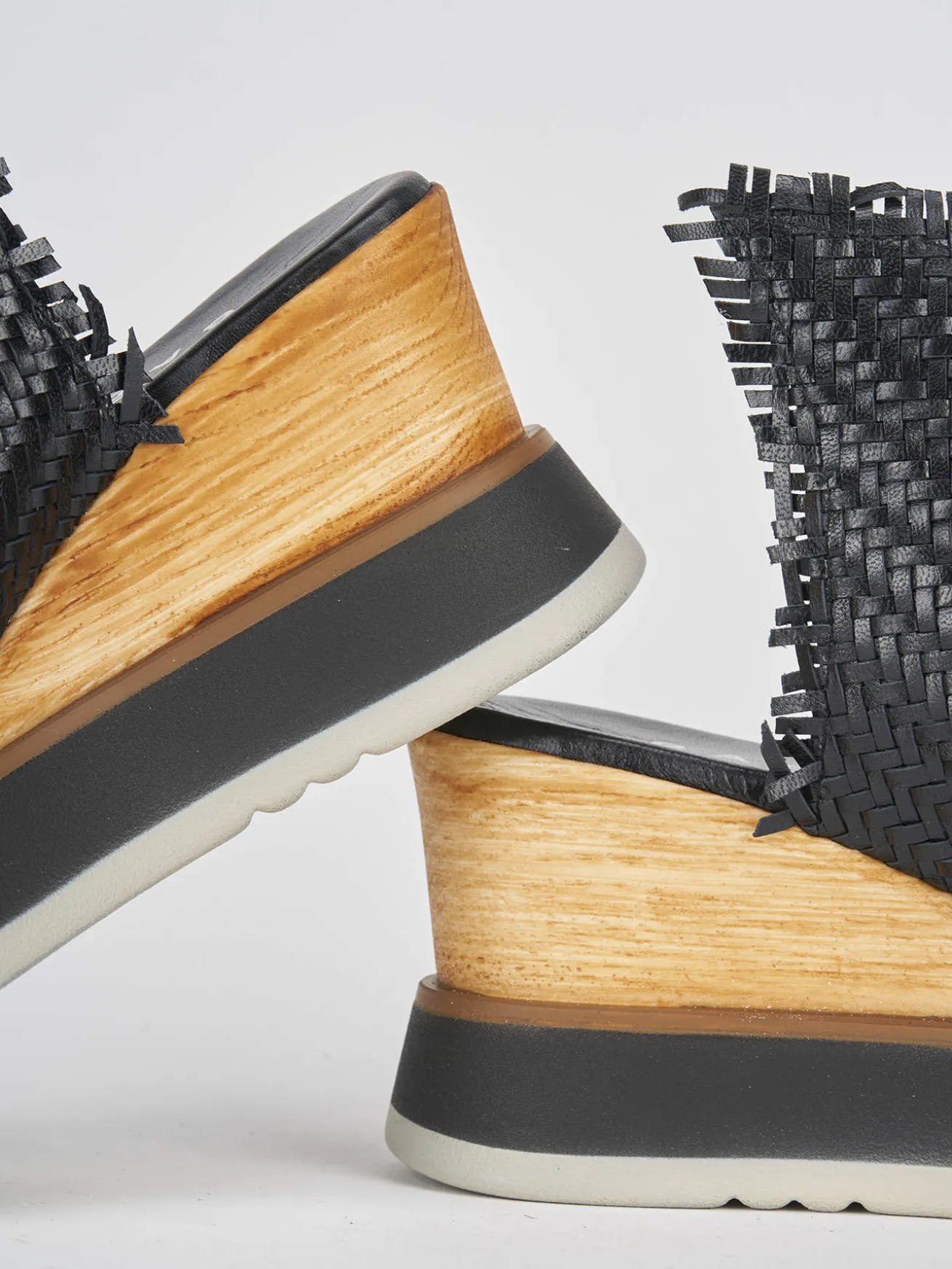 ciabatta zeppa 8 cm fondo in leggera gomma e soletto interno in vera pelle. tomaia in morbida pelle intrecciata, fascia unica con taglio geometrico e plateau 3 cm davanti per un look cool.