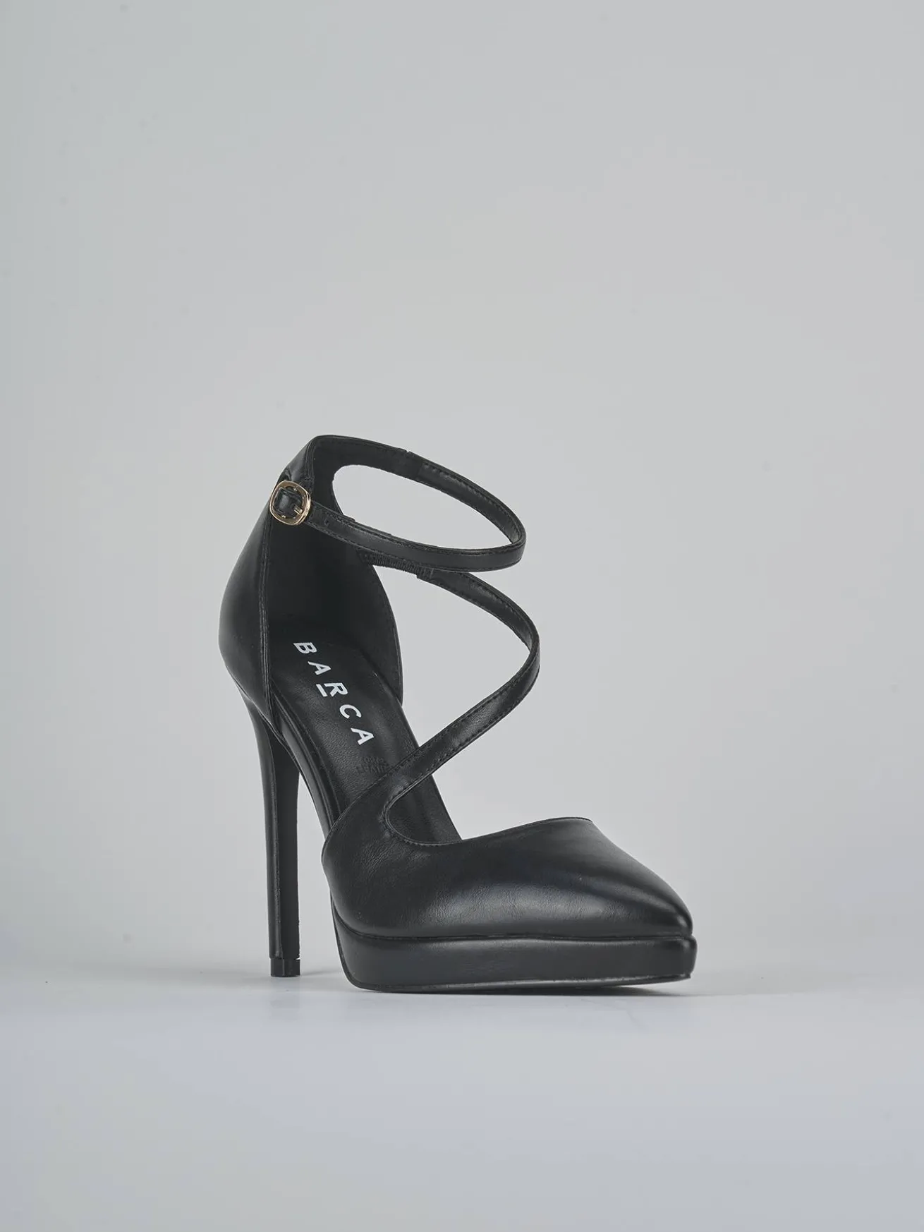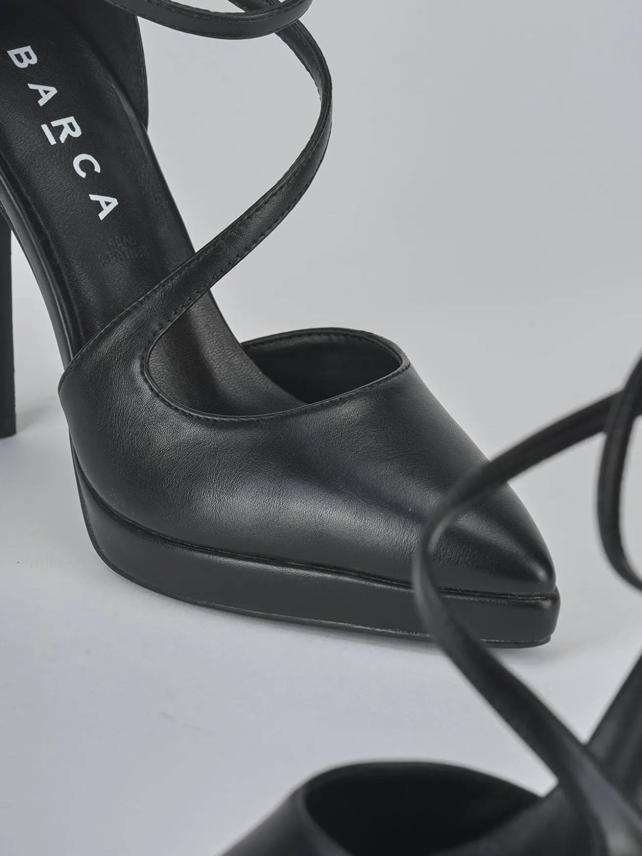Realizzato in pelle sostenibile di colore nero, questo modello vanta un tacco di 10 cm che slancia la figura, mentre il piccolo plateau anteriore di 1 cm garantisce un comfort sorprendente.