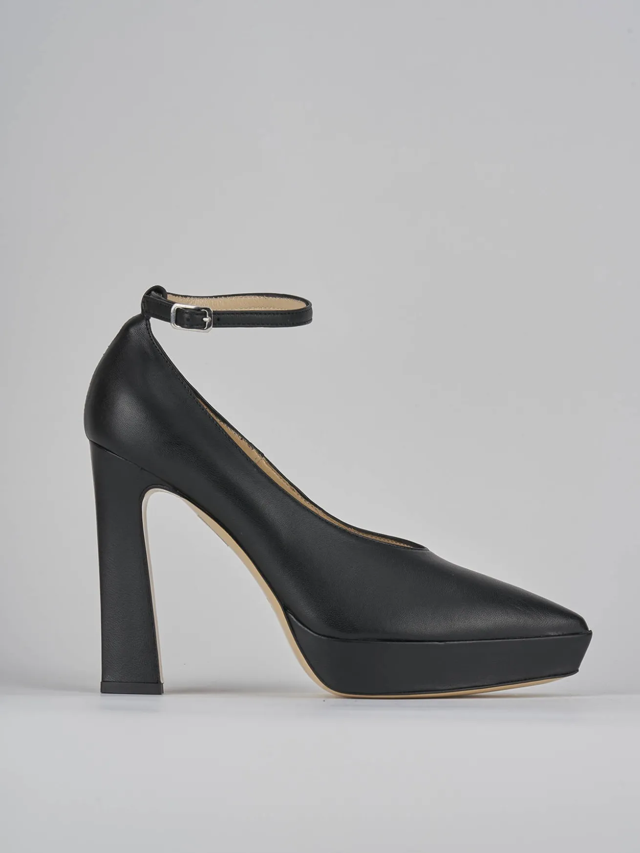 Bebè tacco 11 cm fondo in cuoio e soletto interno in vera pelle. Tomaia in morbida pelle, punta sfilata, cinturino regolabile attorno alla caviglia, plateau di 2 cm e tacco stabile per una camminata agevolata.
