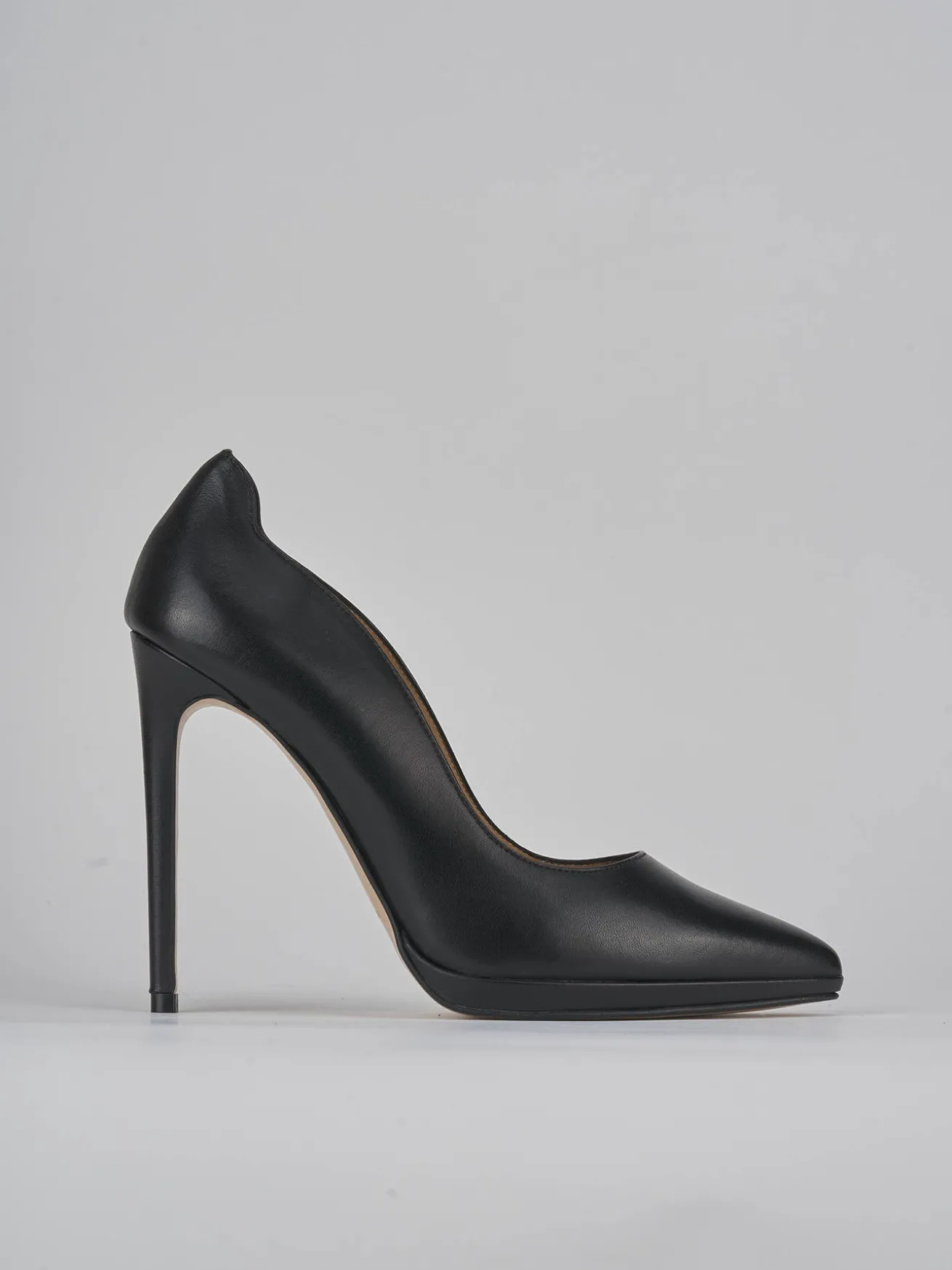 Decoltè tacco 11 cm fondo in cuoio e soletto interno in vera pelle. Tomaia in morbida pelle nappata, punta sfilata, bordi laterali svasati e dalle linee morbide, plateau anteriore di 1 cm e tacco fino per un look versatile e mondano.