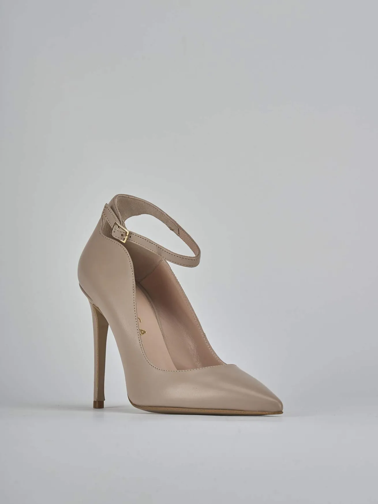 Bebe’ tacco 11 cm fondo in cuoio e soletto interno in vera pelle. Tomaia in morbida pelle nappata, punta sfilata, scollo morbido a ‘U’, bordo svasato, cinturino con fibbia regolabile sulla caviglia e tacco fino. Perfetto con dei jeans e una camicia.