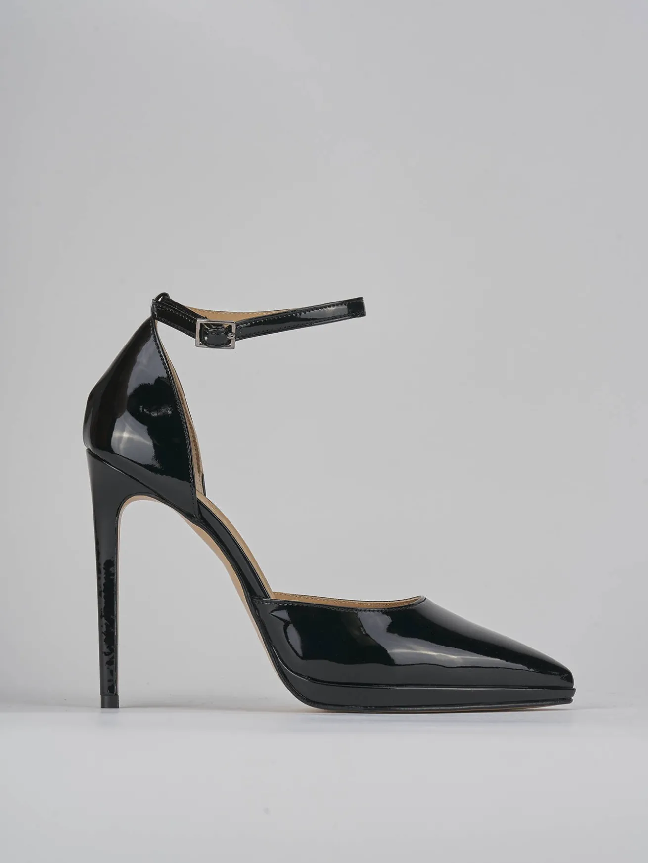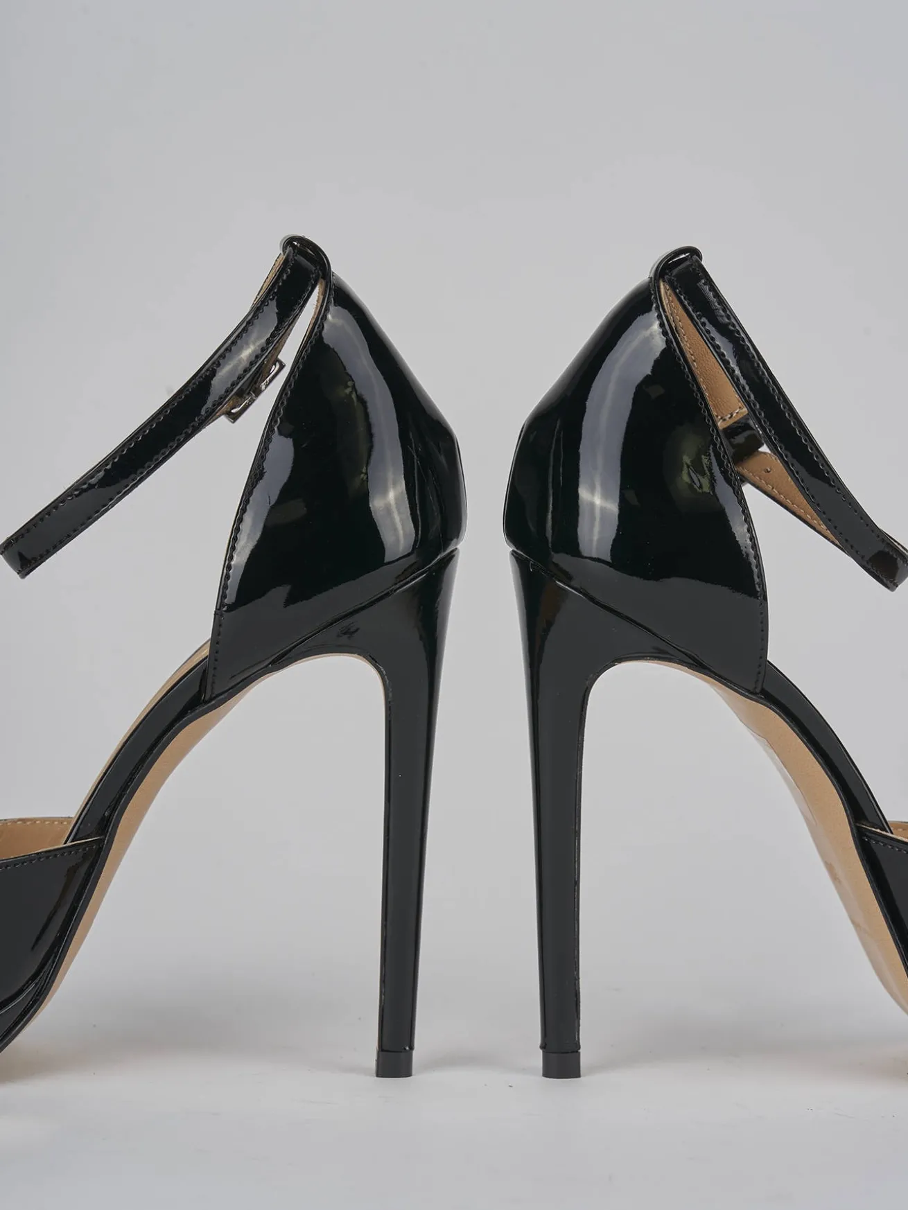 Bebè tacco 11 cm fondo in leggerissima gomma e soletto interno in vera pelle. Tomaia in morbida pelle effetto verniciato, punta sfilata, apertura svasata sulla punta, cinturino regolabile in caviglia, plateau di 1 cm e tacco fino per un look chic.