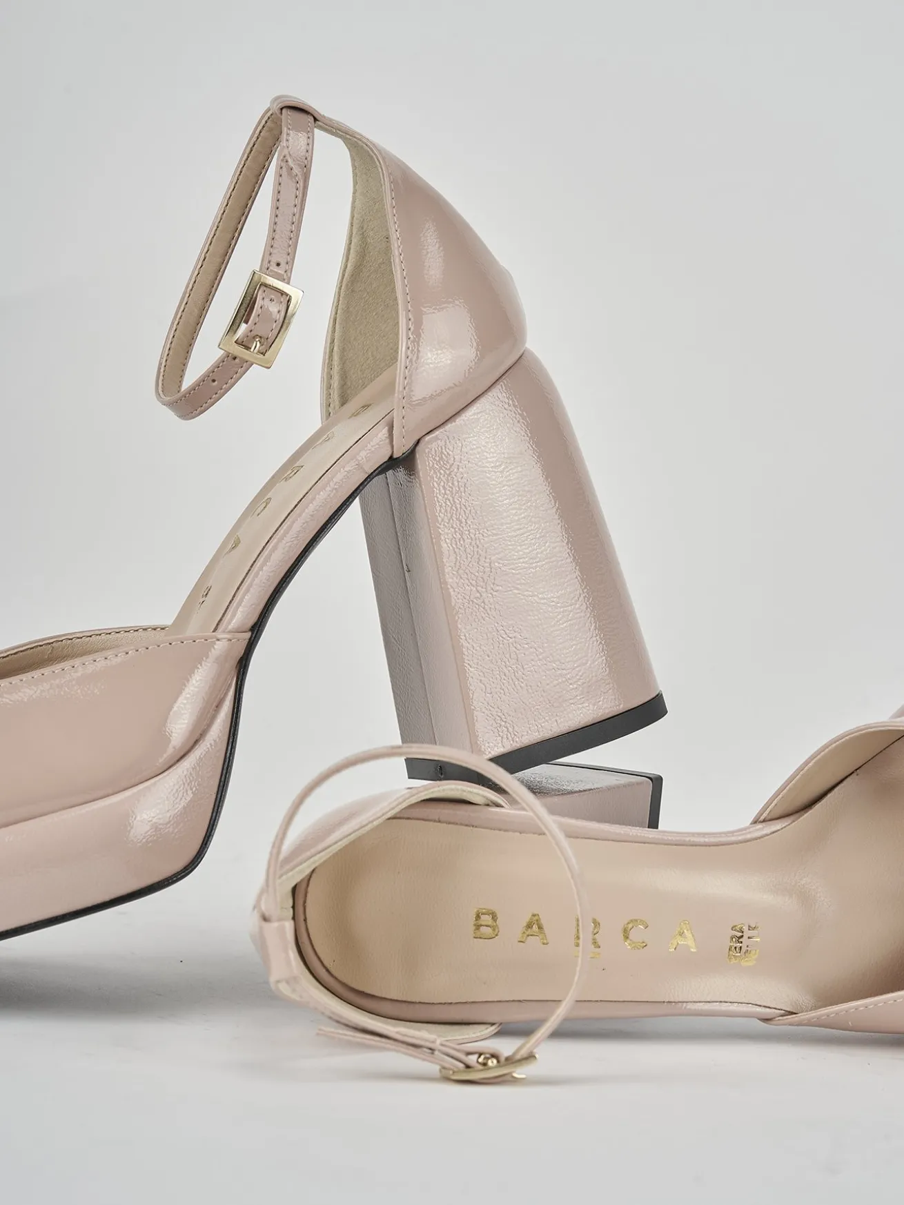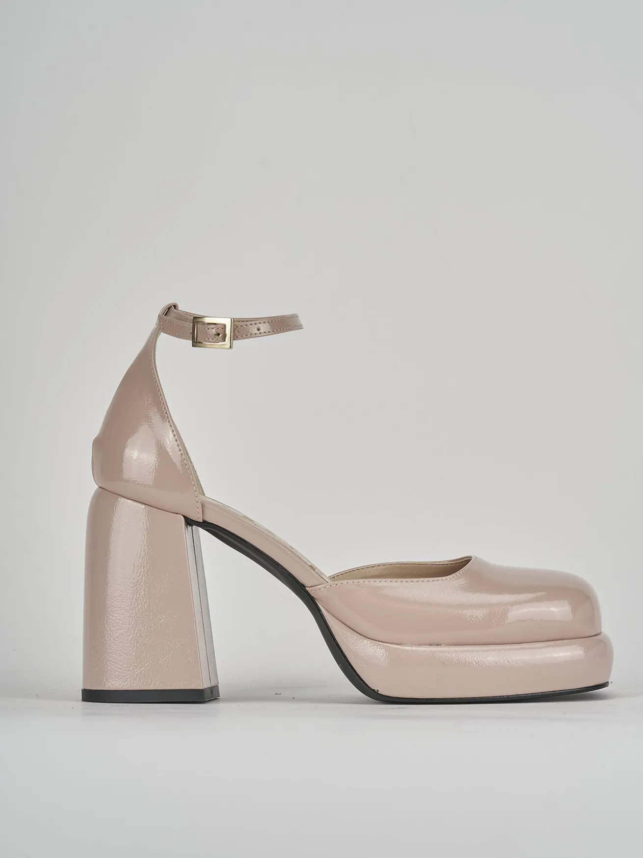 bebe’ tacco 11 cm fondo in gomma e soletto interno in vera pelle. tomaia in morbida pelle verniciata, punta squadrata, plateau anteriore alto 2cm, cinturino regolabile e tacco grosso per un look cool.