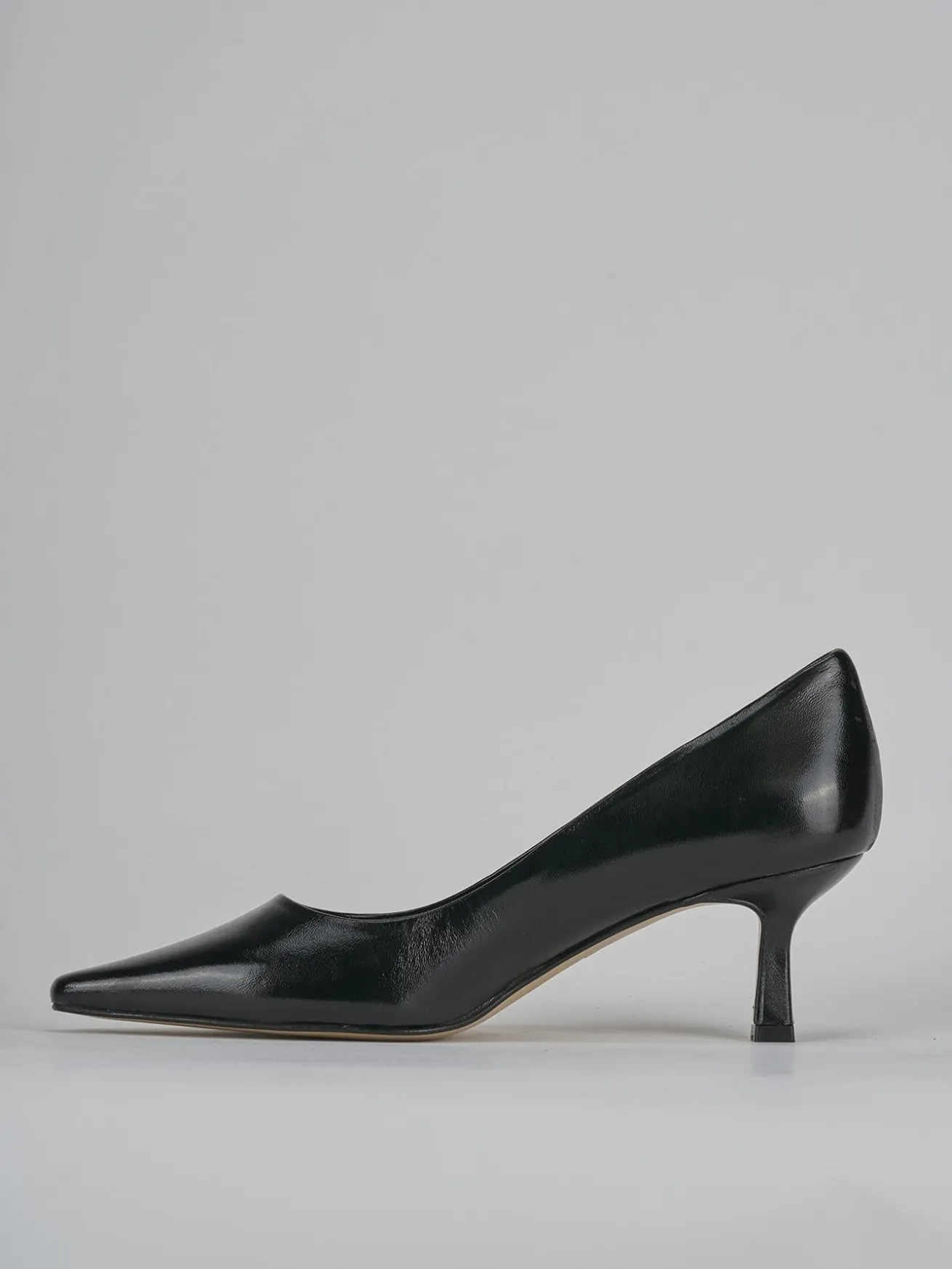 La tomaia in morbida pelle effetto verniciato dona un tocco di lucentezza, mentre la punta sfilata leggermente squadrata aggiunge un dettaglio moderno e chic.