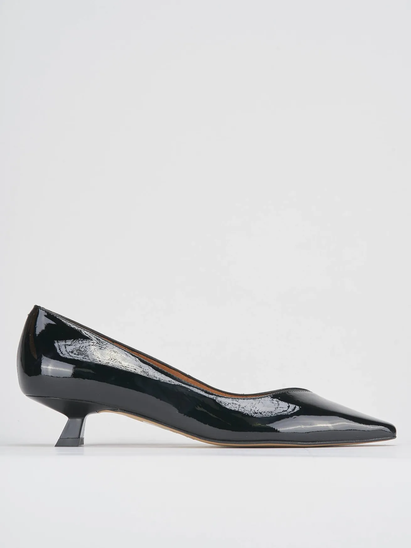 decolte’ tacco 3 cm fondo in leggera gomma e soletto interno in vera pelle. tomaia in morbida pelle efeftto verniciato, punta sfilata, apertura svasata e nuovissimo tacco a rocchetto per un look cool.