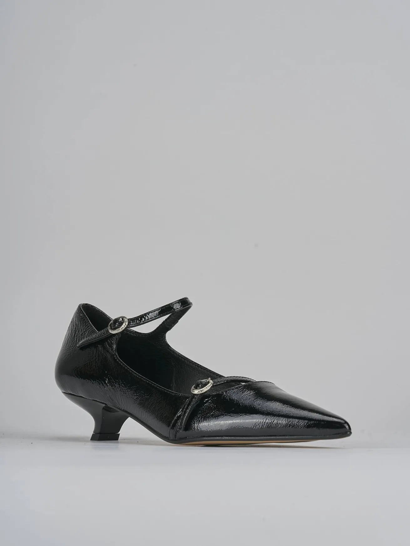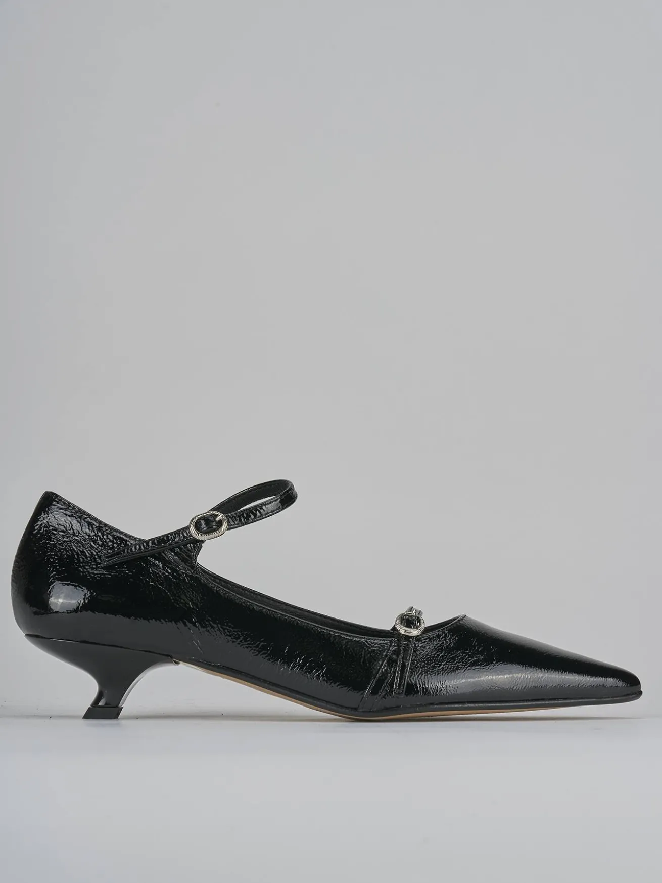 La tomaia in morbida pelle effetto verniciato dona un aspetto lucido e raffinato, mentre la punta sfilata e lo scollo dolce a ‘U’ esaltano la femminilità della scarpa.