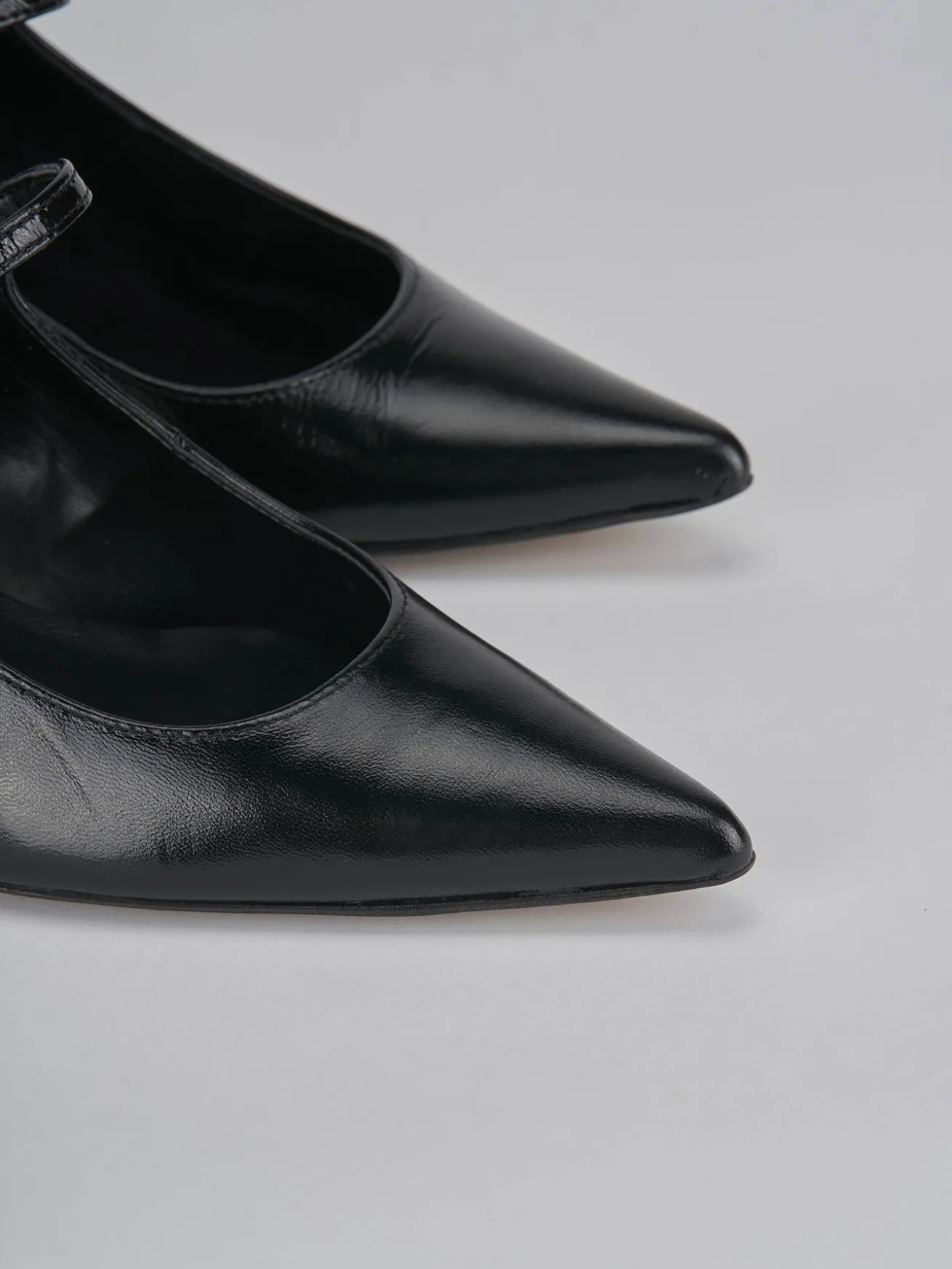 Bebè tacco 5 cm fondo in gomma e soletto interno in vera pelle. Tomaia in morbida pelle effetto verniciato, punta sfilata, doppio cinturino regolabile e comodo tacco rocchetto. perfetto con una gonna di jeans e un maglione.