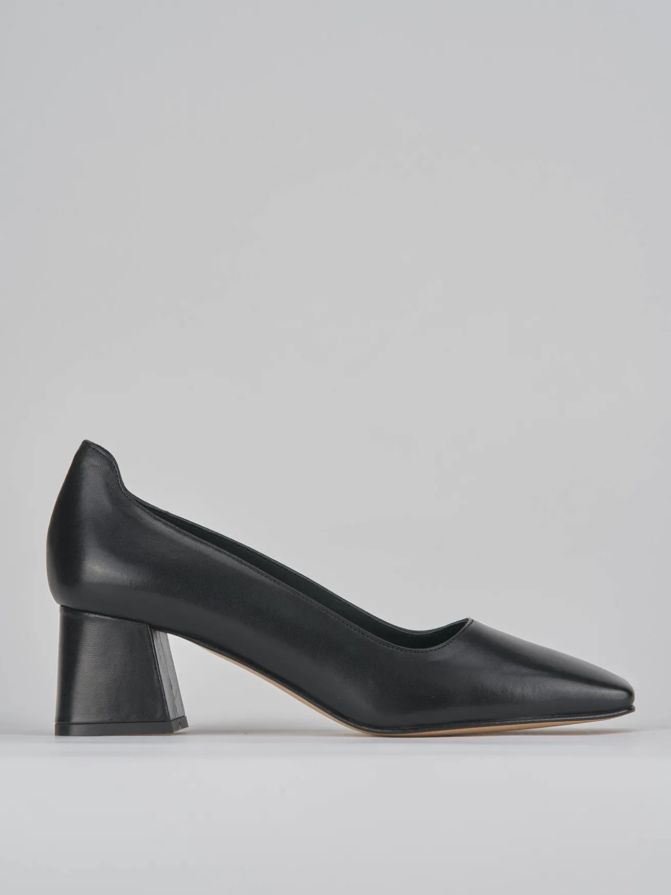 Decoltè tacco 5 cm fondo cuoio e soletto interno in vera pelle. Tomaia in morbida pelle nappata, punta squadrata, apertura squadrata sulla punta del piede, tallone leggermente più alto che protegge e tacco grosso per un look cool.