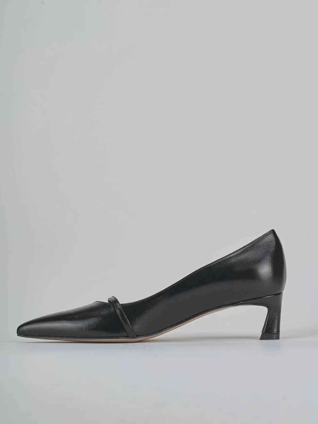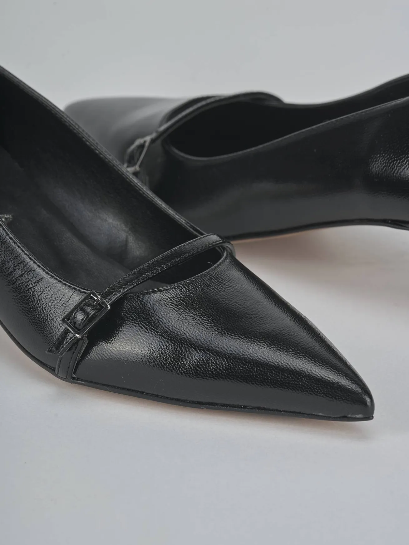 La tomaia in morbida pelle effetto verniciato si distingue per la sua punta sfilata e lo scollo a ‘U’, che aggiungono un tocco di classe.