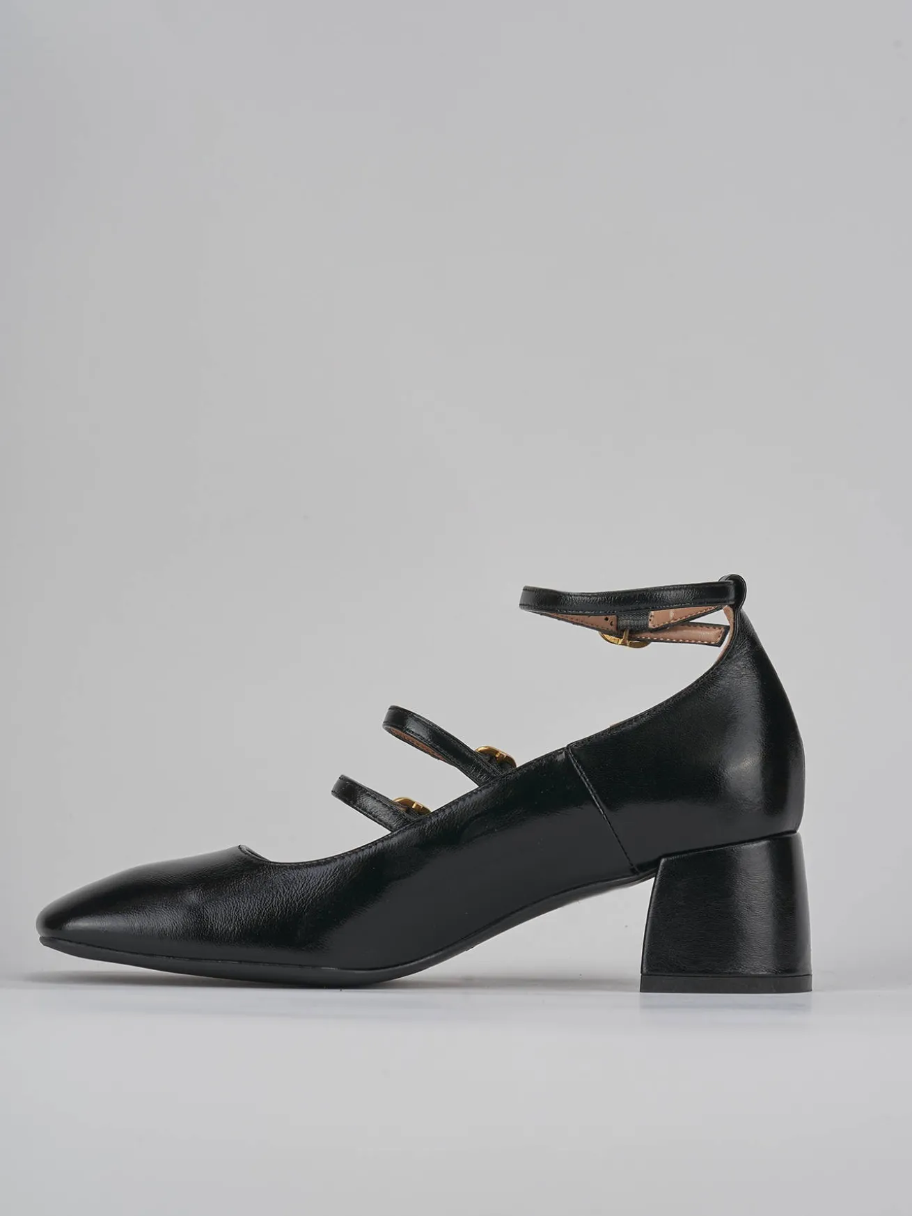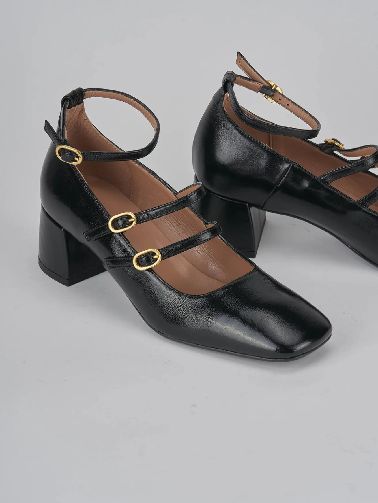bebe’ tacco 4.5 cm fondo in gomma e soletto interno in vera pelle. tomaia in morbida pelle effetto verniciato, punta squadrata, 2 cinturini sul collo del piede e 1 cinturino in caviglia con fibbia regolabile. dalla linee definite ed eleganti, perfetto per un look cool.