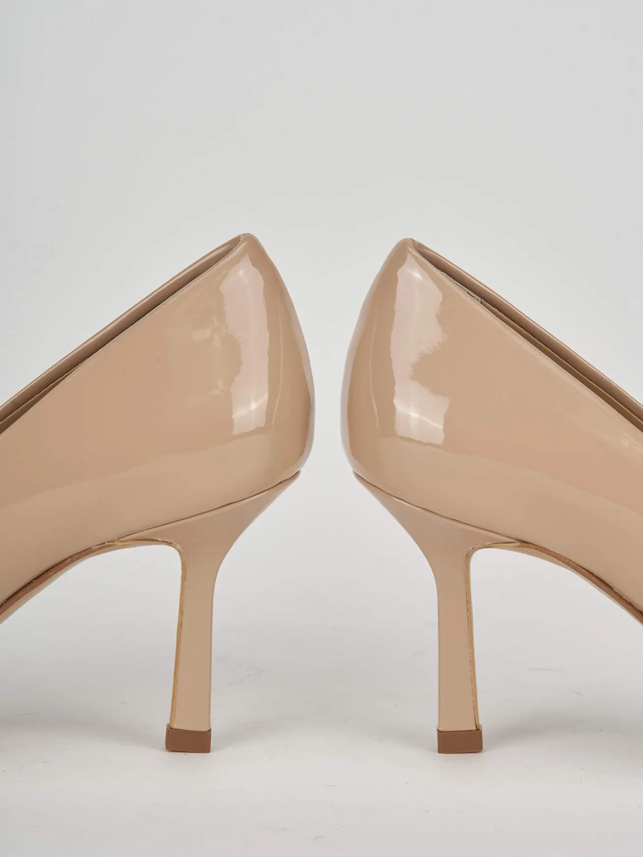 La tomaia in morbida pelle verniciata si distingue per la sua lucentezza raffinata, mentre la punta sfilata conferisce un aspetto moderno e sofisticato.