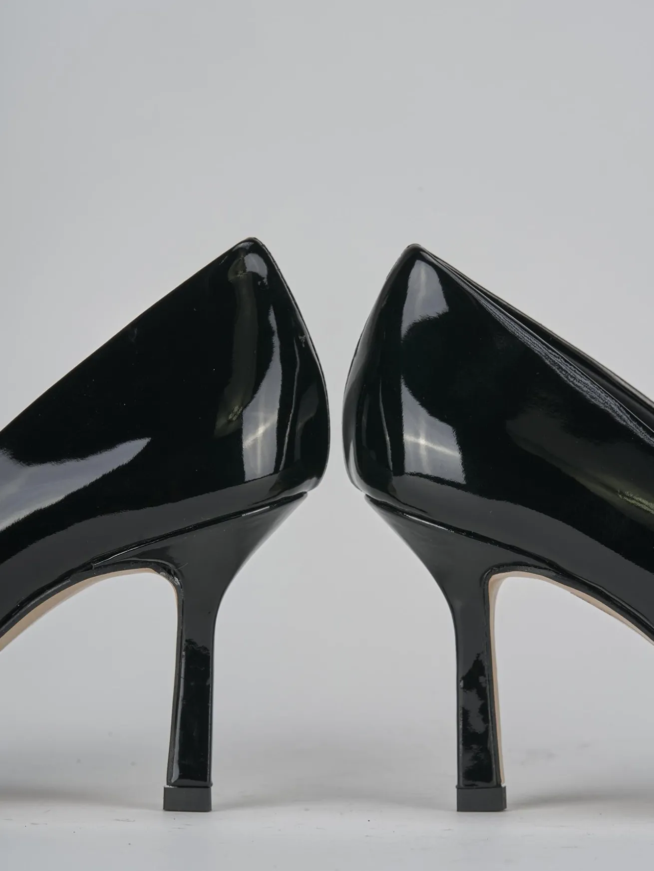La tomaia in morbida pelle effetto verniciato dona un look sofisticato e moderno, mentre la punta sfilata e lo scollo squadrato aggiungono un dettaglio chic e ricercato.