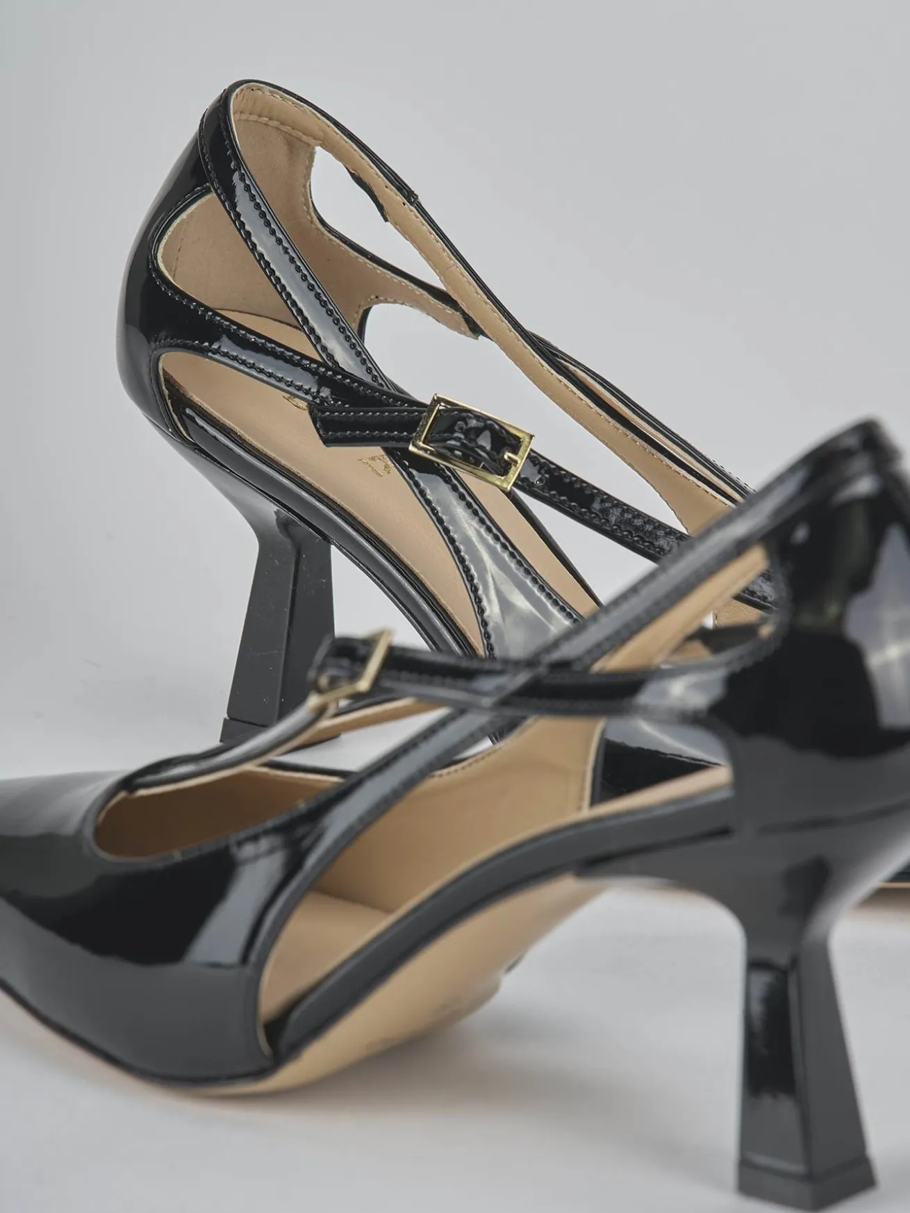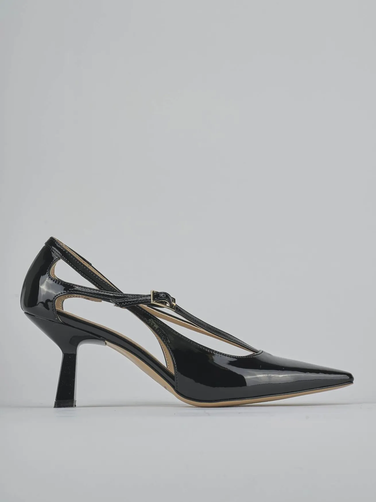 Decolte’ tacco 7 cm fondo in leggerissima gomma e soletto interno in vera pelle. Tomaia in morbida pelle effetto verniciato, punta sfilata, scollo a ‘U’, due cinturini incrociati con fibbia e tacco rocchetto. Aperto lateralmente per un look fierce.