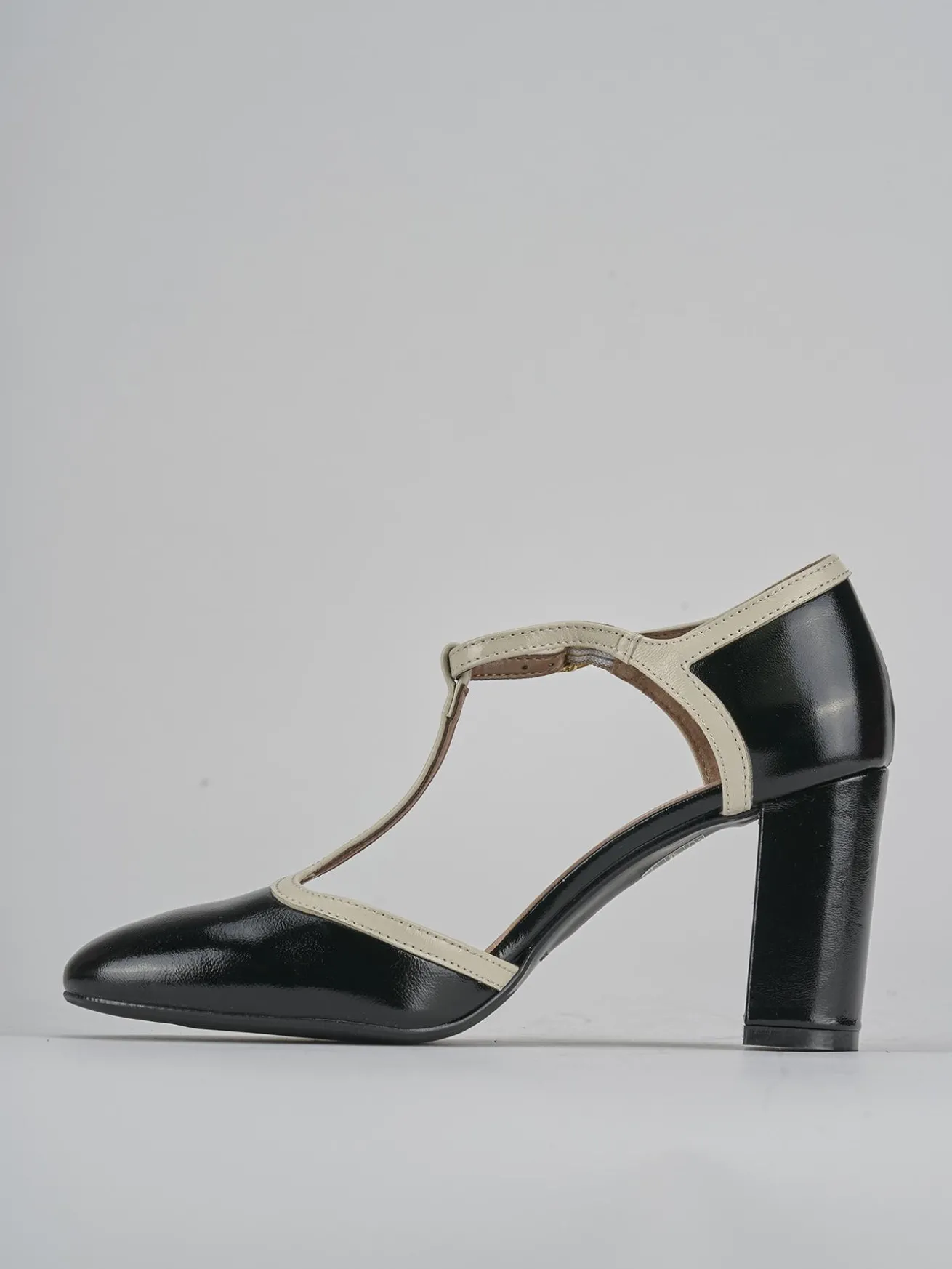 Il tacco grosso garantisce stabilità, mentre il fondo in leggerissima gomma e il soletto interno in vera pelle assicurano comfort per tutto il giorno.