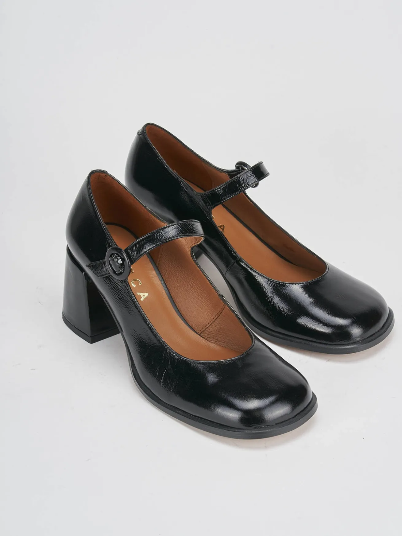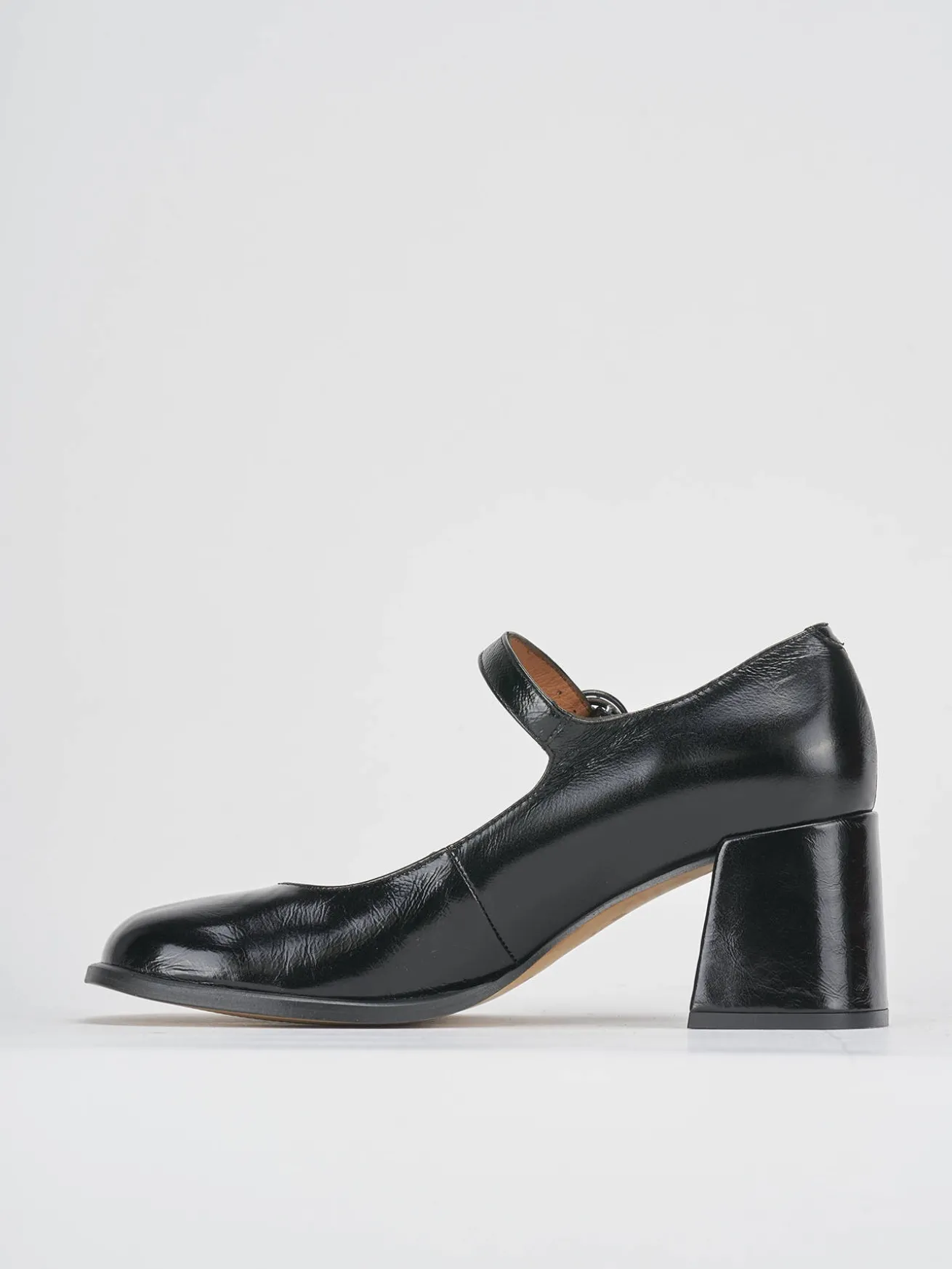 bebe’ tacco 8 cm fondo in gomma e soletto interno in vera pelle. tomaia in morbida pelle effetto verniciato, punta squadrata, cinturino regolabile. dalla linee morbide ed eleganti per un look senza tempo.