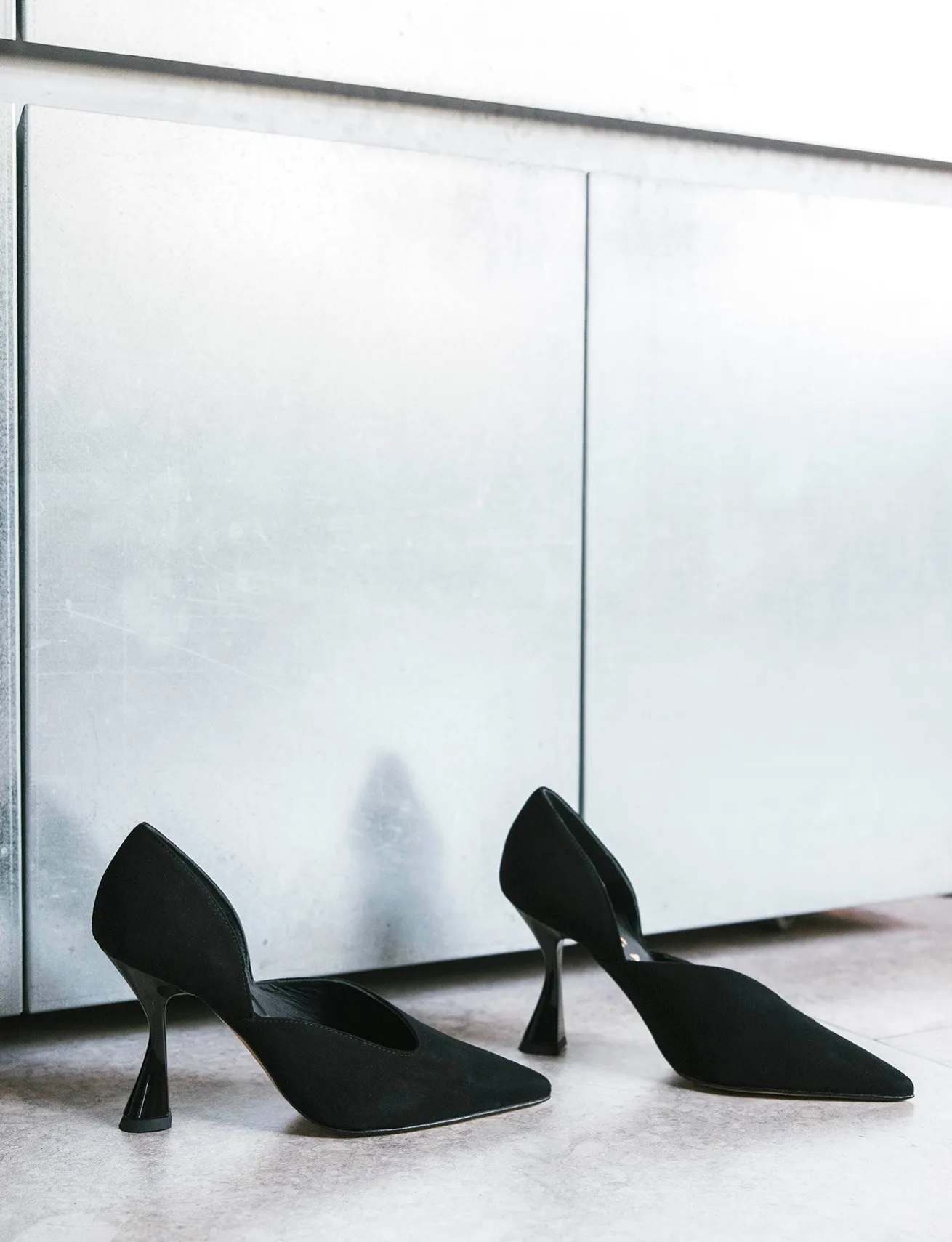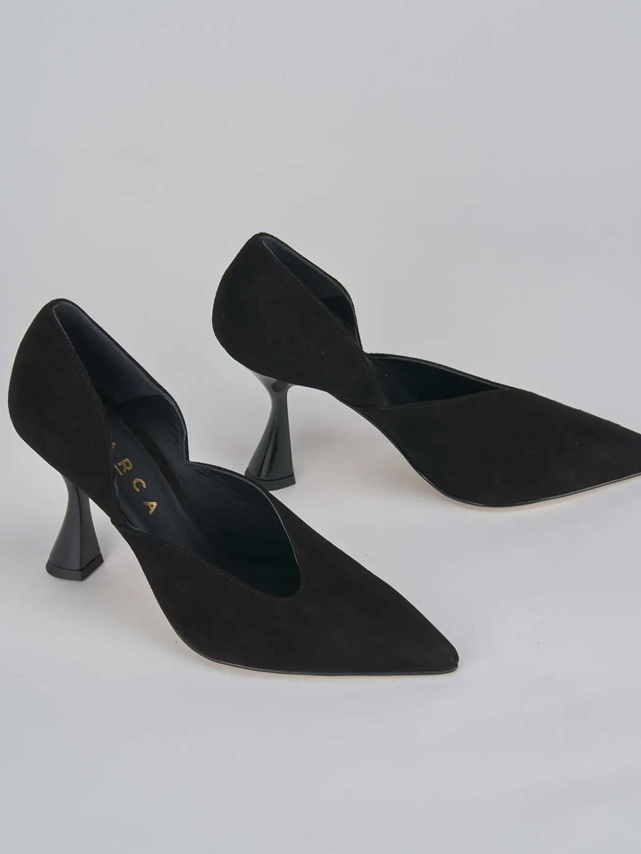 Decoltè tacco 9 cm fondo in cuoio e soletto interno in vera pelle. Tomaia in morbido camoscio, punta sfilata, apertura asimmetrica sulla punta del piede, aperto sui lati e tacco rocchetto in materiale abs per un look che va oltre le stagioni.
