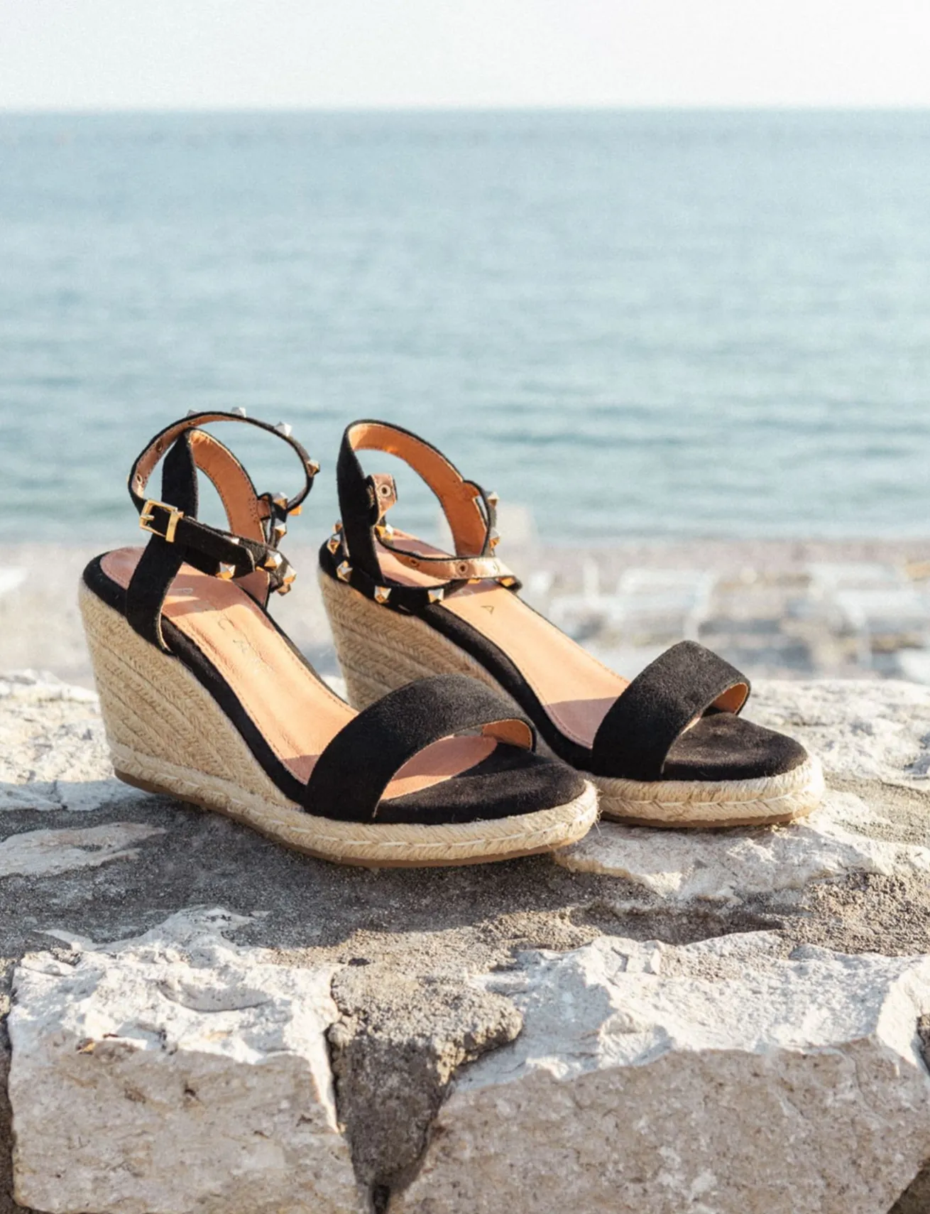 Espadrilla zeppa 9 cm fondo in gomma e soletto interno in vera pelle. Tomaia in morbido camoscio sostenibile, punta affusolata, fascia unica in punta, cinturino a incrocio con fibbia regolabile e borchie per un look chic. Piccolo plateau di 1 cm anteriore.