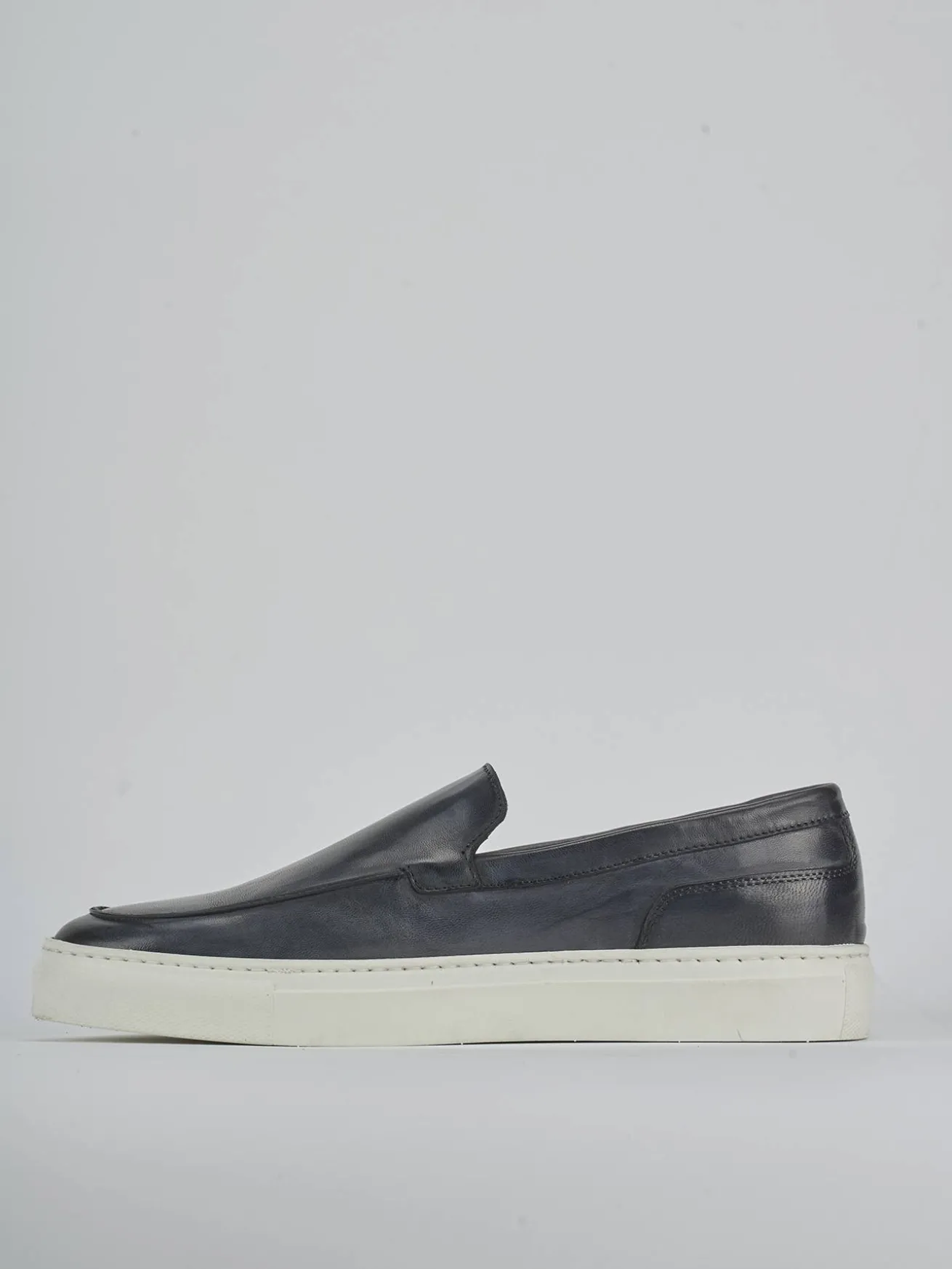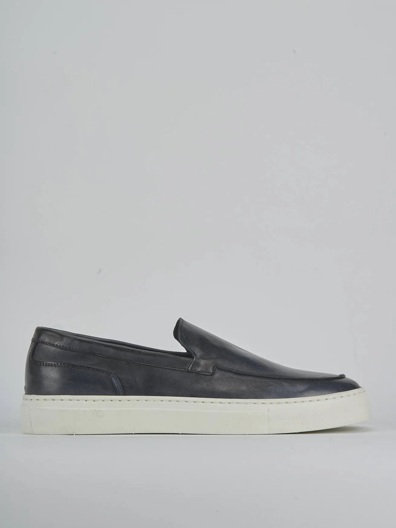Il contrasto tra la pelle blu e il fondo chiaro rende questi mocassini un accessorio versatile, perfetto per completare qualsiasi outfit, dal casual al formale.