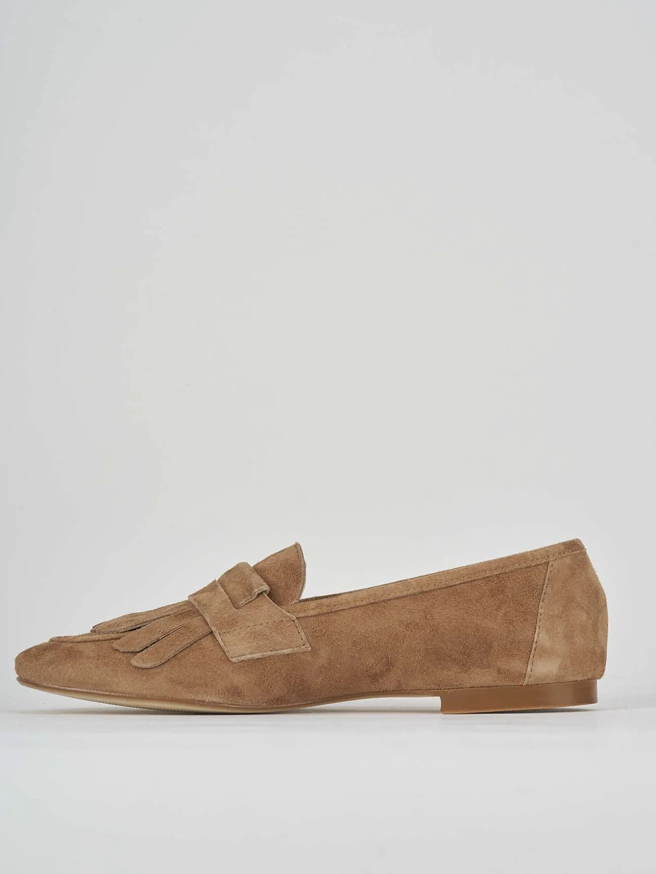 La tomaia presenta una raffinata punta affusolata con cuciture ben definite e una particolare frangia che aggiunge un tocco di stile.