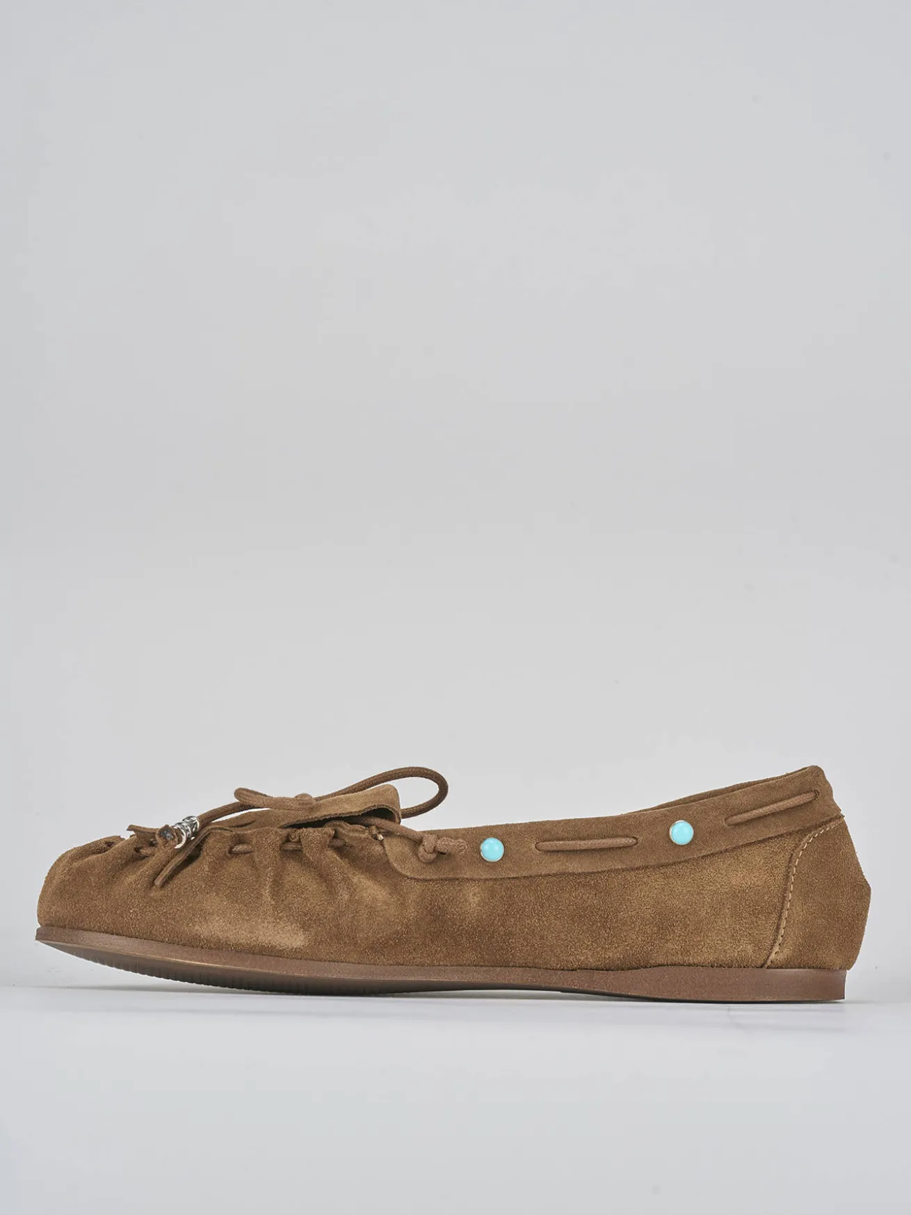 La tomaia è realizzata in morbida pelle scamosciata, arricchita da un elegante fiocco con frange e dettagli in metallo a contrasto, per un tocco di classe in più.