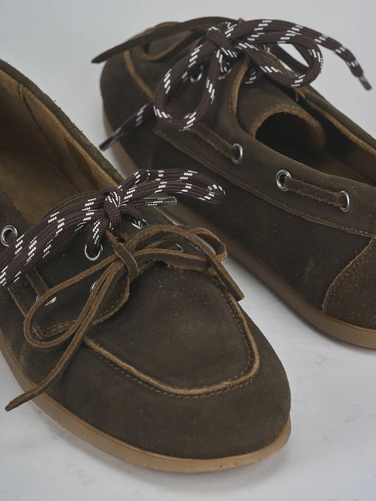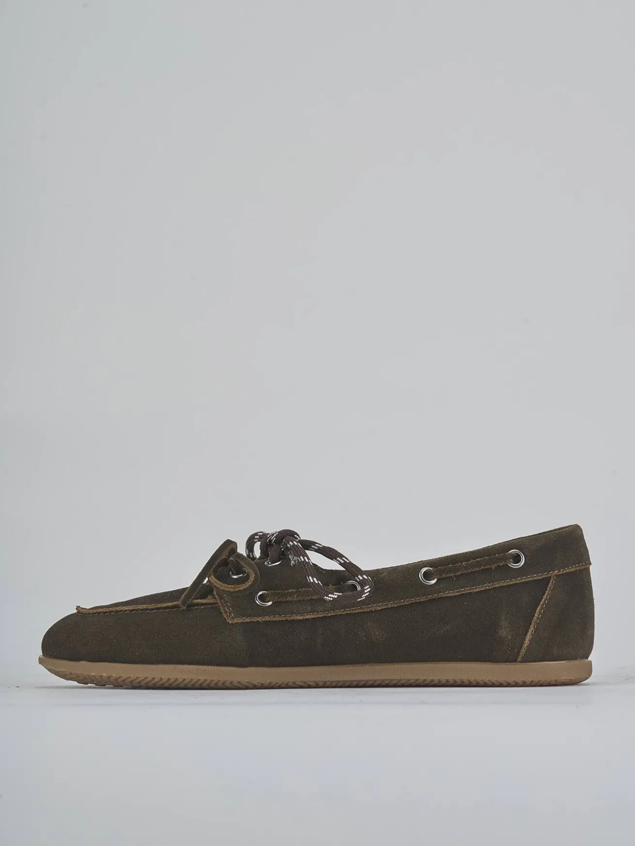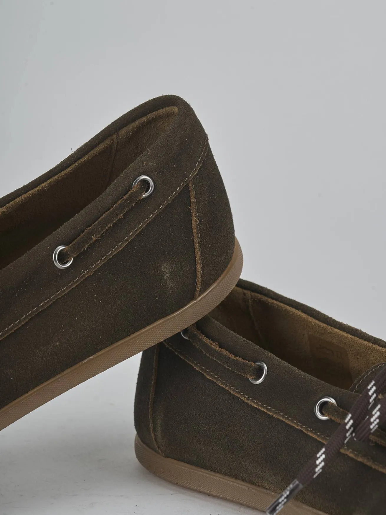 La tomaia in morbida pelle nabuk presenta una punta affusolata e cuciture a mano, esaltando l’artigianalità del design.