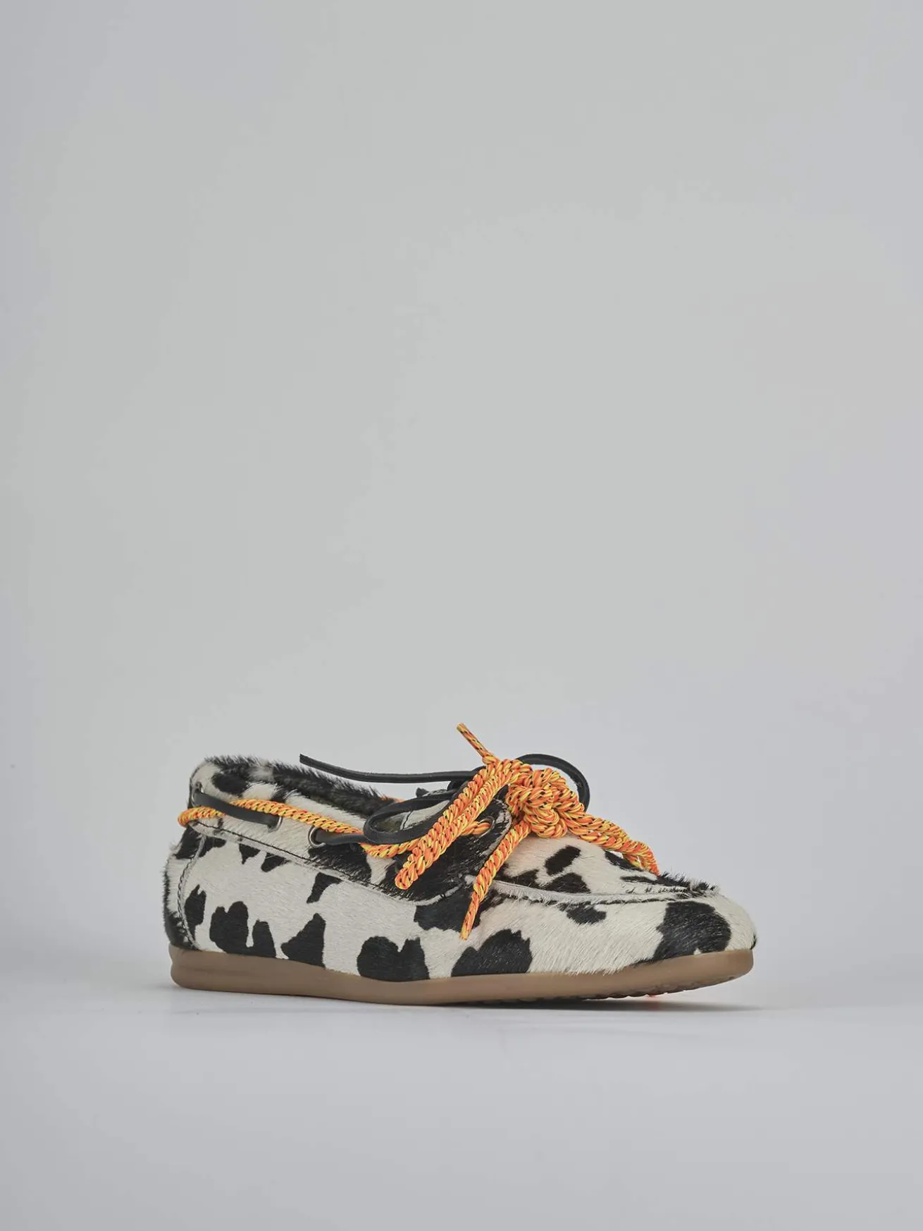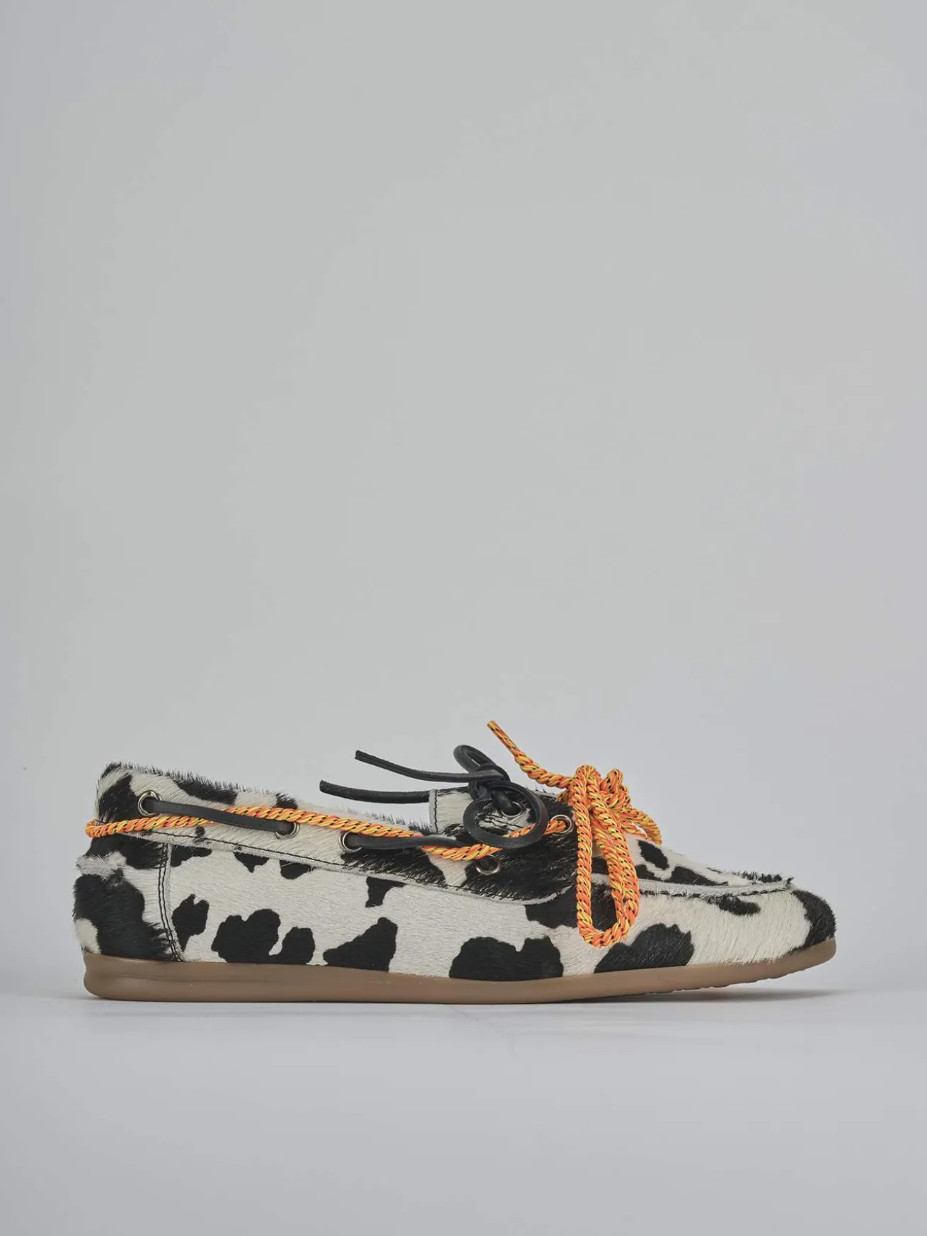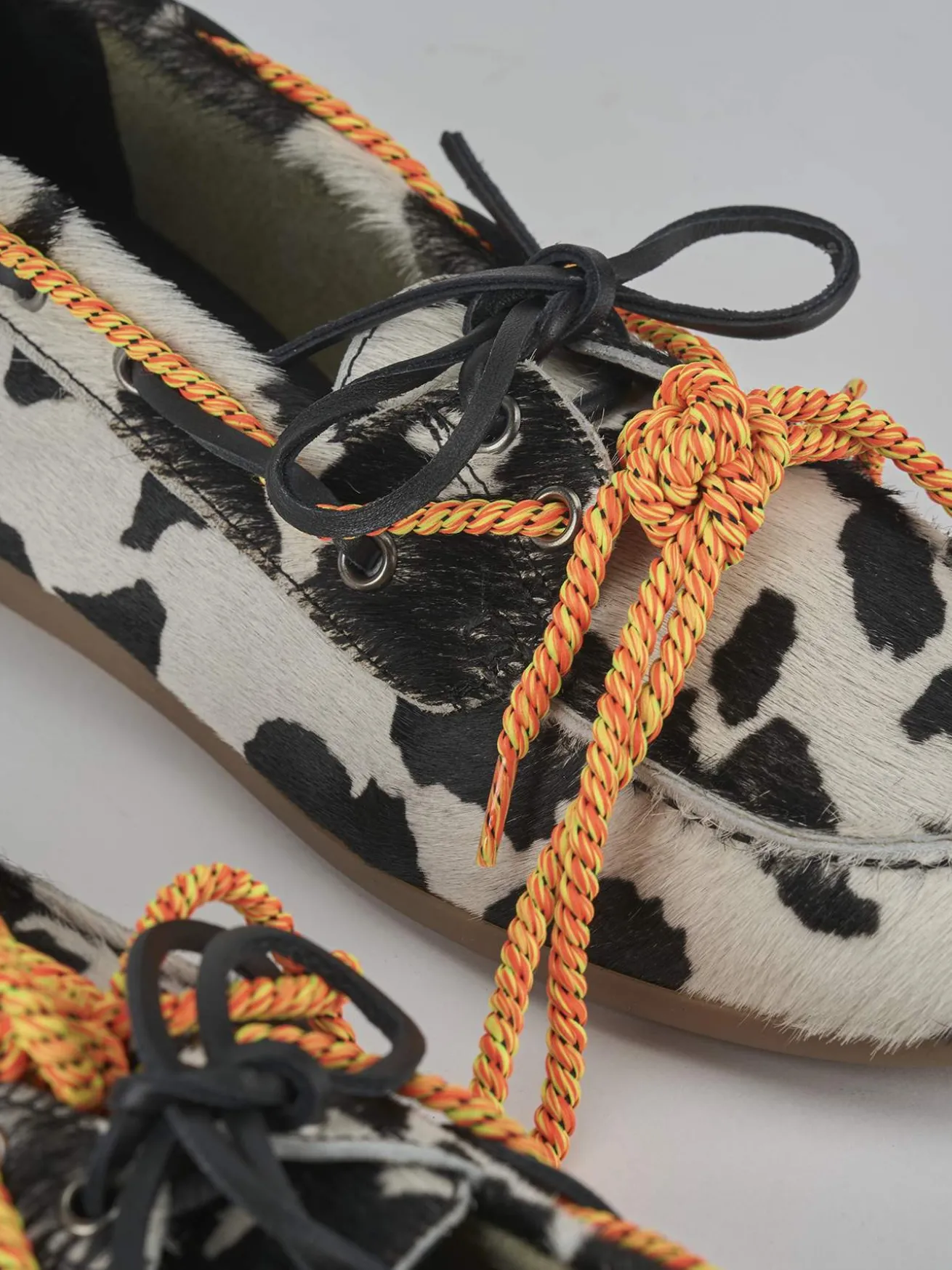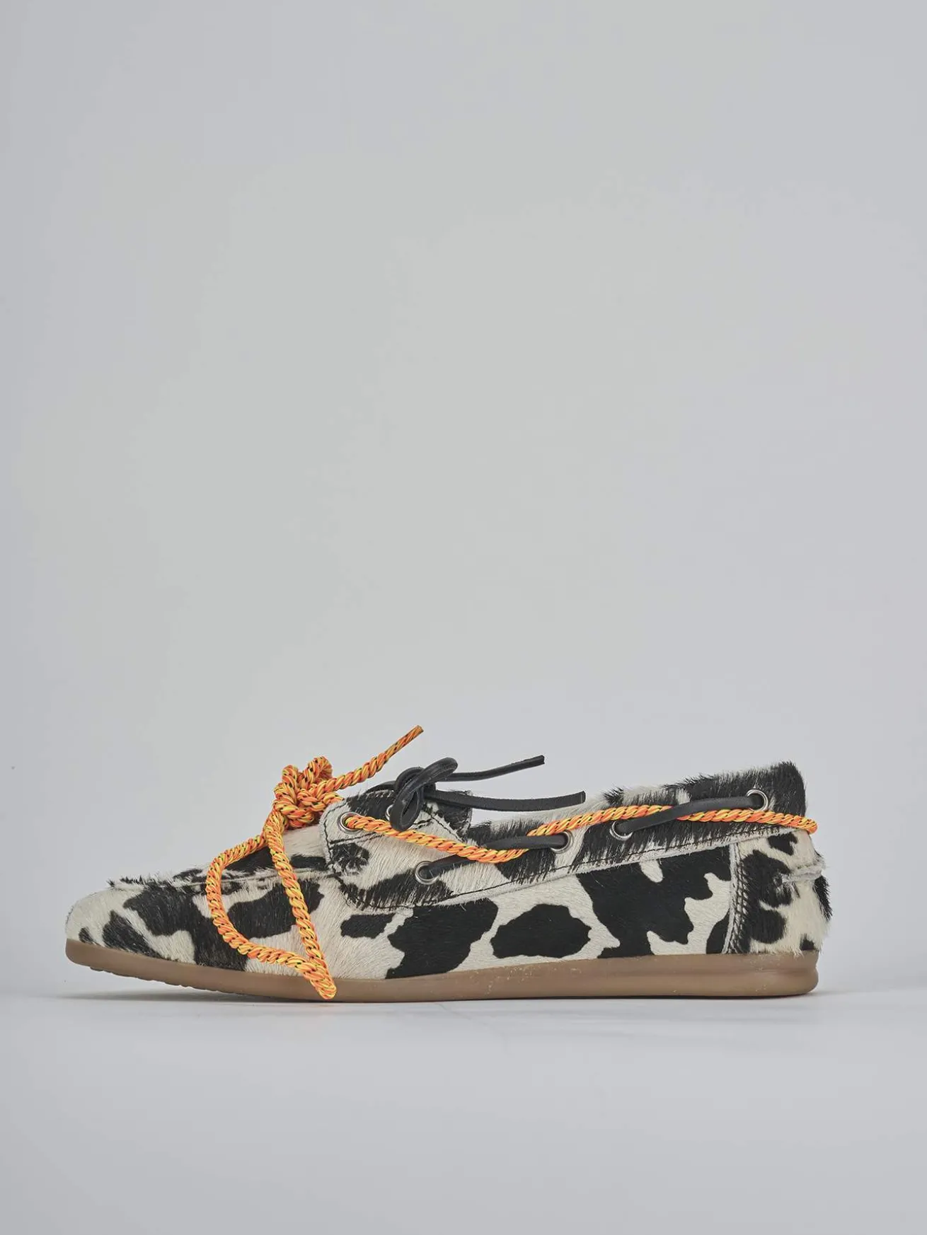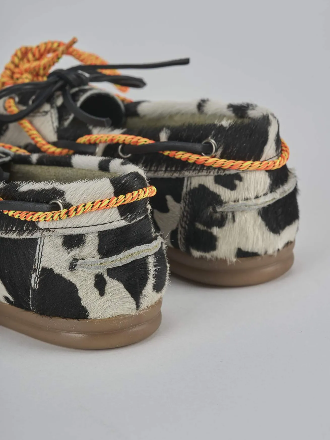 Realizzati in morbida pelle nera, presentano una tomaia foderata in cavallino con un vivace motivo a macchie.