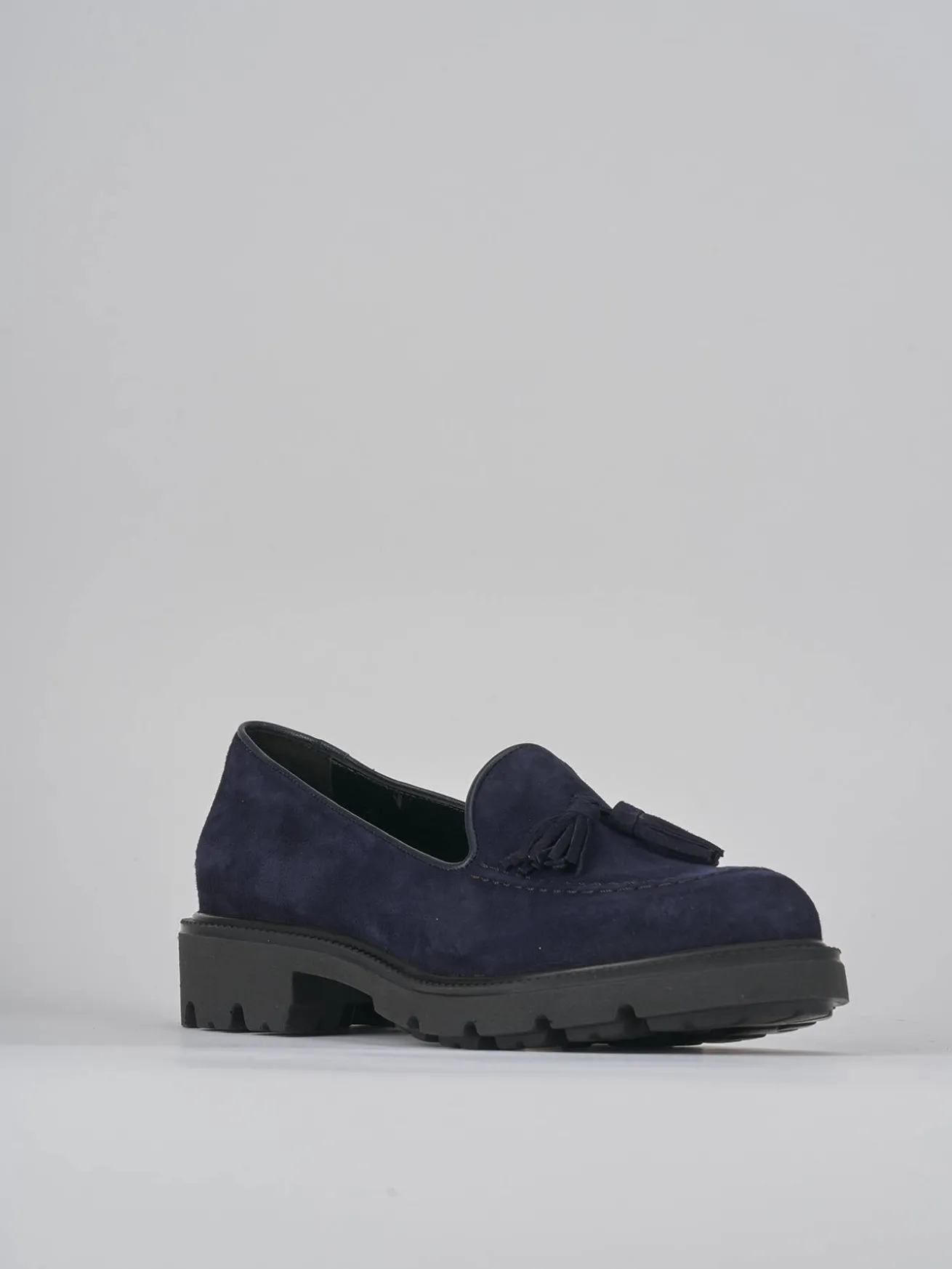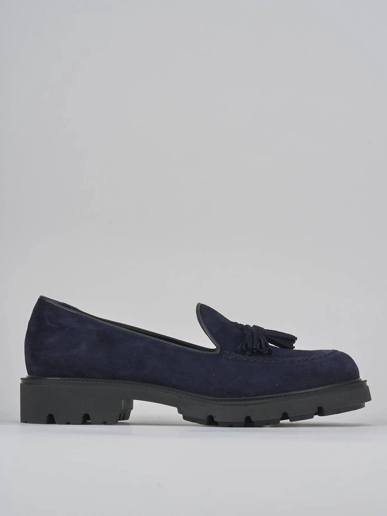 Mocassino tacco 2 cm fondo in gomma e soletto interno in vera pelle. Tomaia in morbido camoscio, punta affusolata, cuciture visibili, nappine e fondo light per un look chic. adatto con dei jeans o un vestito.