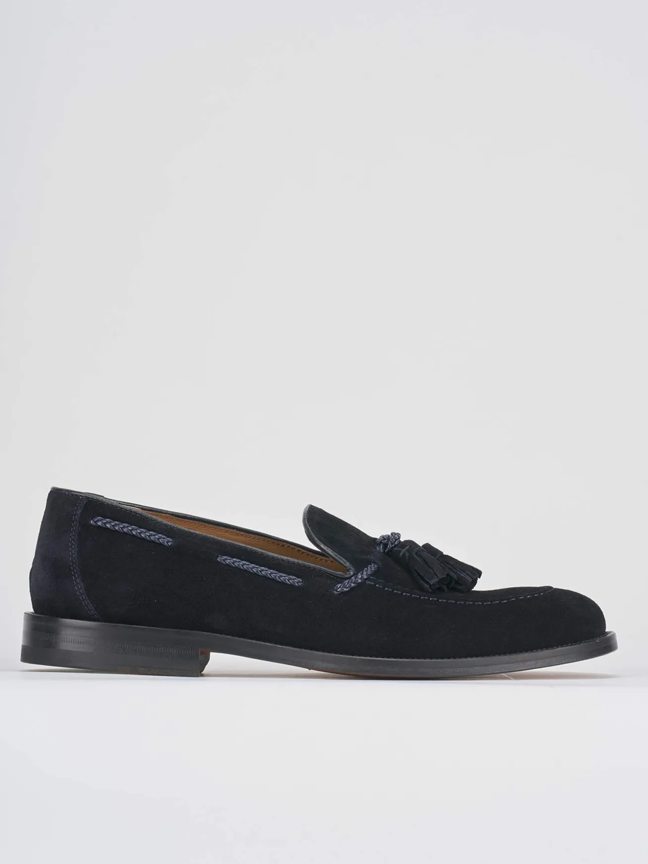 mocassino fondo in cuoio e soletto interno in vera pelle. Tomaia in morbidissimo camoscio con particolarissimo bordo con treccina in pelle e nappina sul collo del piede. English style!